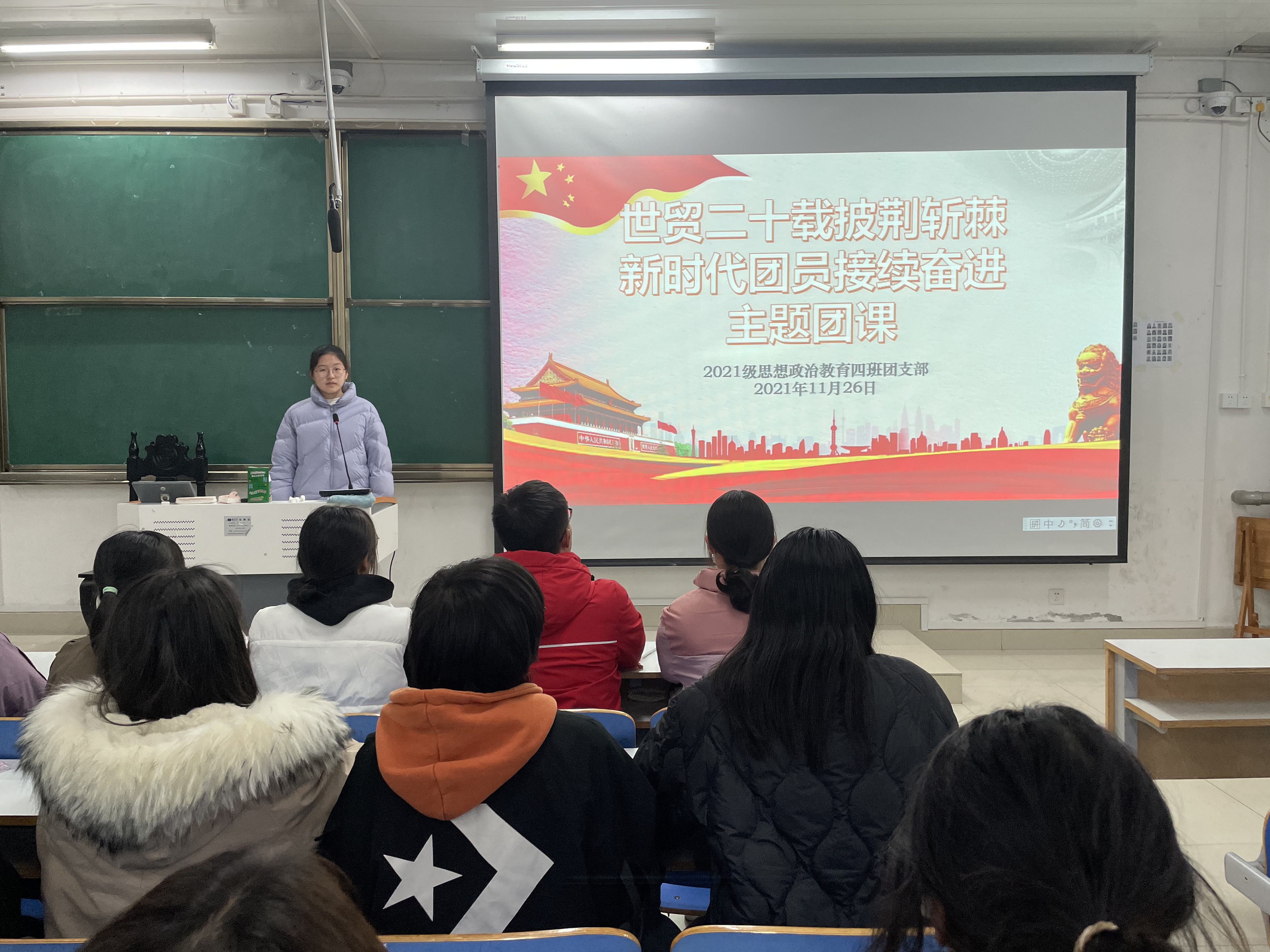 11月26日下午,2026年世界杯官网2021级思想政治教育四班在社科楼514召开“世贸二十载披荆斩棘,新时代团员接续奋进”主题团课。2021级思想政治教育四班全体团员参加本次主题团课,团课由团支书刘珂含主持。