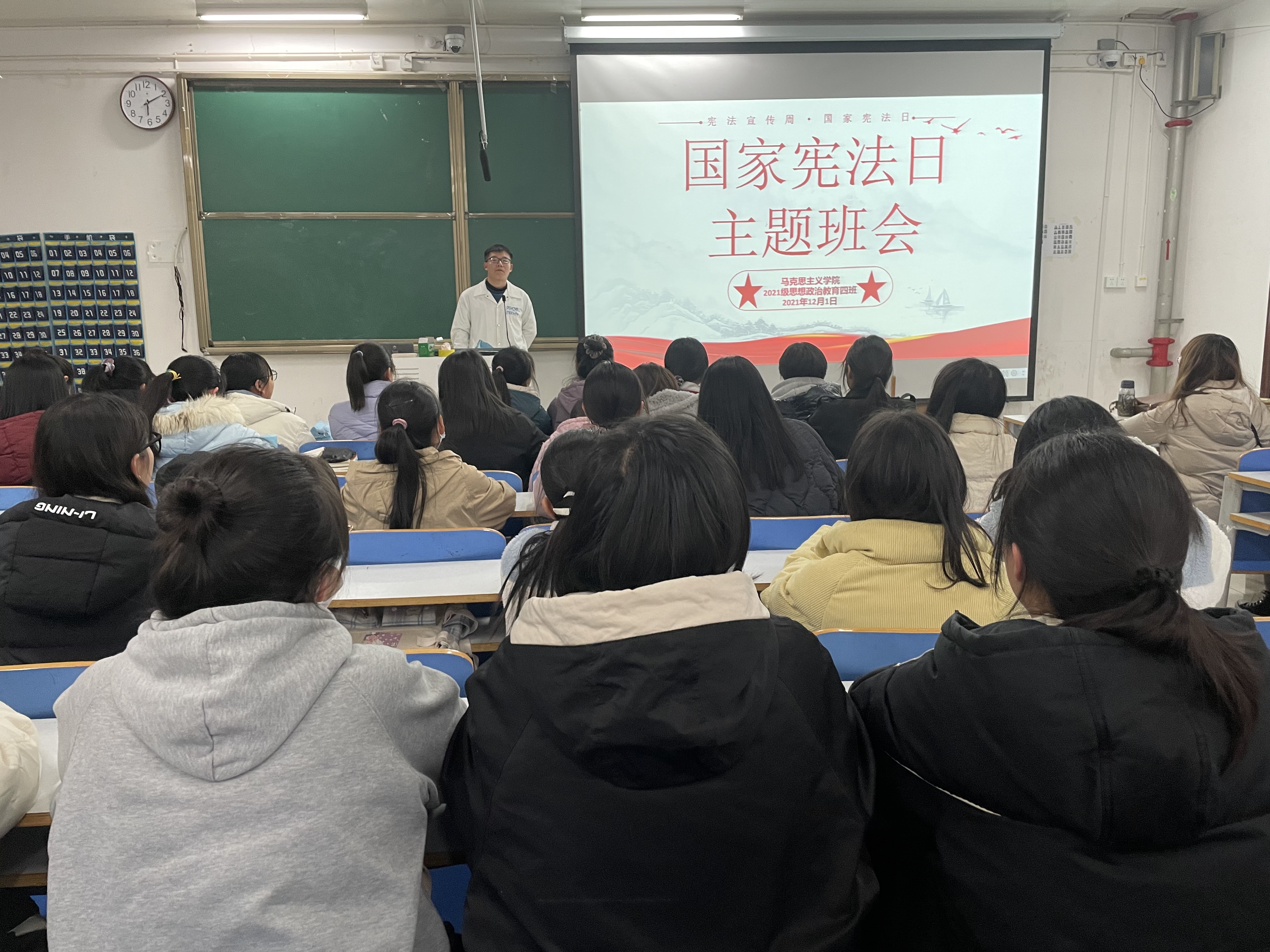 为深入学习习近平新时代中国特色社会主义思想,大力弘扬宪法精神,12月1日上午,2026年世界杯官网2021级思想政治教育四班在社科楼514教室召开宪法宣传周主题班会。2021级思想政治教育四班全体同学参加此次班会,班会由副班长常康哲主持。