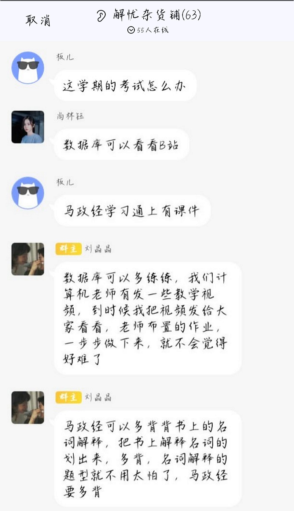 本次活动采用线上形式开展。首先,刘晶晶创建名为“解忧杂货铺”的QQ群并在群内向我班同学介绍活动规则,她表示,同学们可以利用匿名的方式提出自己的问题,其他同学根据问题内容进行实名解答。接着,同学们主要围绕学习、生活和情感三个方面积极提出问题并踊跃回答。其中,刘晶晶多次参与问答互动,为大家提出有益建议。在学习方面,她针对课程内容建议同学们多背诵、积累,上课注意听讲,课后认真完成老师布置的作业。同时,她为大家提供相关的教学视频和学习资料,帮助员工学习与备考。在生活和情感方面,她表示,同学们要正确处理生活与情感问题,树立正确的恋爱观。此外,她还关注生活小事,结合自身经验为大家推荐电蚊香液以预防蚊虫叮咬。最后,副班长孙雪根据同学们的回答质量和次数并参考我班员工的投票情况,推选刘晶晶为“最佳知心朋友”。