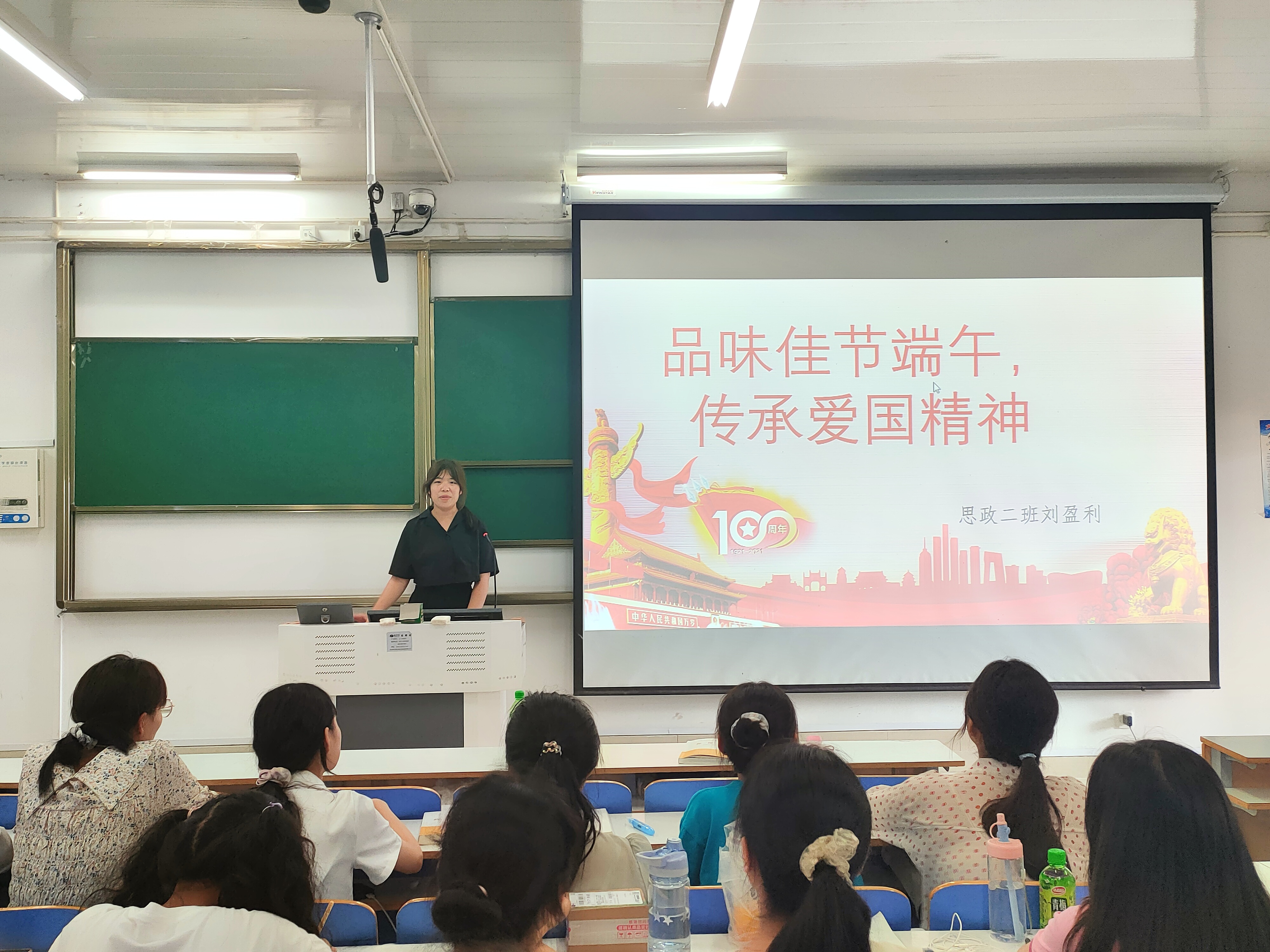 团课上,刘盈利主要从端午节的起源与主要习俗,爱国诗人屈原的生平事迹、历史地位与影响,学习屈原爱国精神的意义三个部分进行讲述。 首先,她对端午节的起源和节日别名两个方面进行简要介绍,具体说明端午的主要习俗及其蕴含的美好寓意,着重讲解了纪念屈原起源说。接着,她通过播放视频与幻灯片的方式带领我班团员学习爱国诗人屈原的生平事迹、历史地位及其影响,感悟爱国情怀。最后,她重点讲述了学习屈原英雄事迹的重要意义。她指出,屈原不仅是我们热爱和崇敬的对象,更是中华文化和民族精神的一个标志和符号,广大团员要积极主动学习屈原的爱国精神,把爱国精神变成报国行动,为中华民族伟大复兴奉献青春力量。