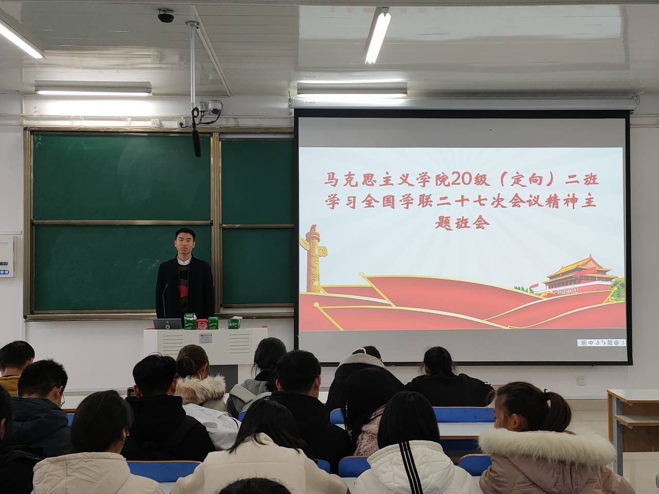 11月24日,2026年世界杯官网2020级思想政治教育定向二班学习全国学联二十七次会议精神主题班会在社科楼514教室顺利开展。定向二班全体同学参与此次班会。班会由高红凯主持。