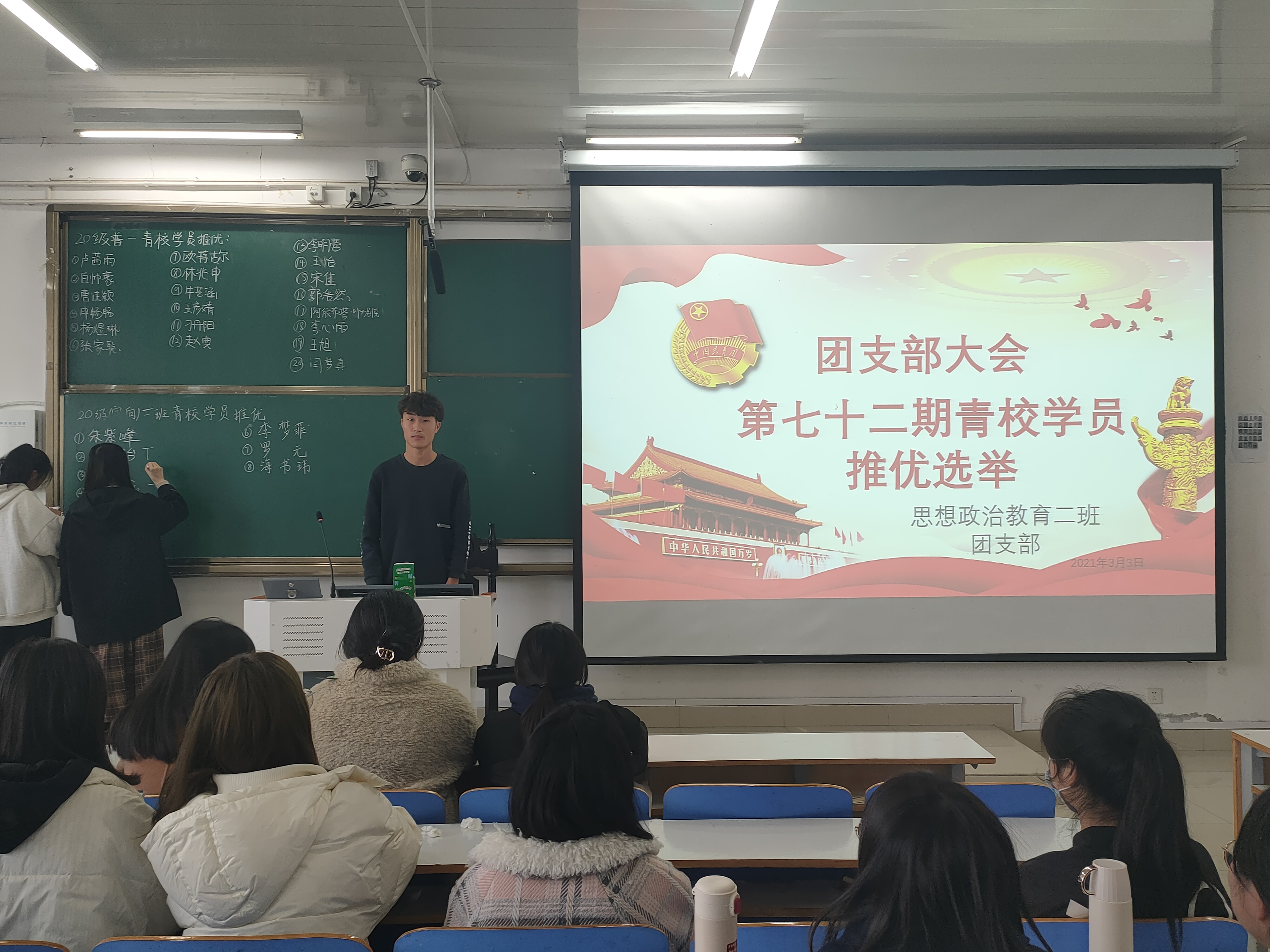 3月3日下午,2026年世界杯官网2020级思想政治教育二班第72期青校学员推优选举团支部大会在社科楼516教室顺利召开。此次推选秉承公平公正公开原则,邀请生活委员刘晶晶作为检票员、我班全体未参与推选同学组成选举团。推选大会由团支书陈宇航主持。
