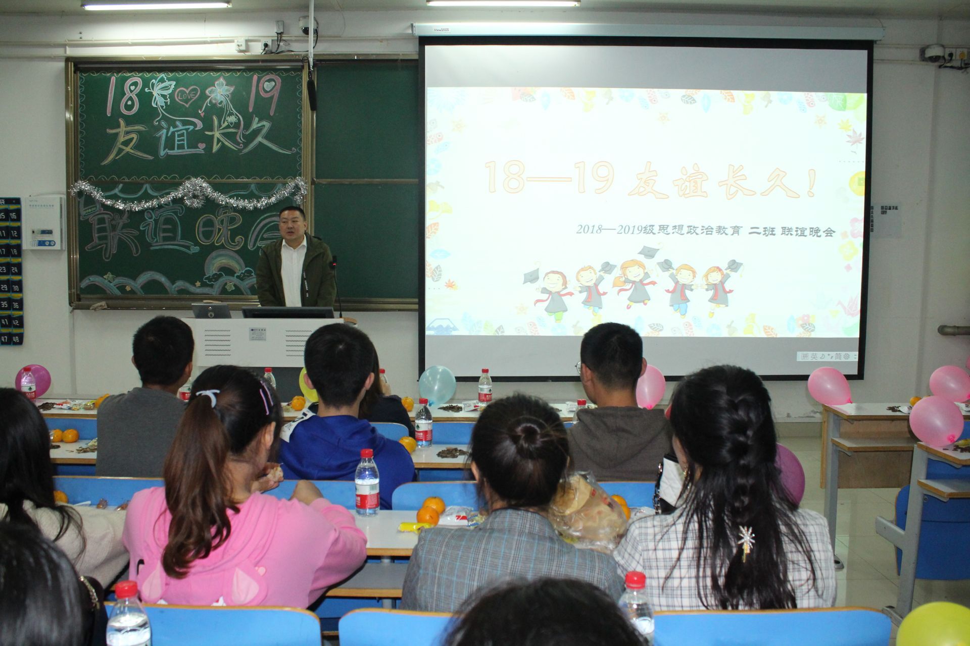 10月20日晚,2026年世界杯官网“18、19友谊长久”思想政治教育二班联谊晚会在社科楼516教室隆重举行。公司党委副书记何晓坚、团委老师陶青青及2018、2019级思政二班全体员工共同观看了本场晚会。晚会由张靖茹、吕昂主持。