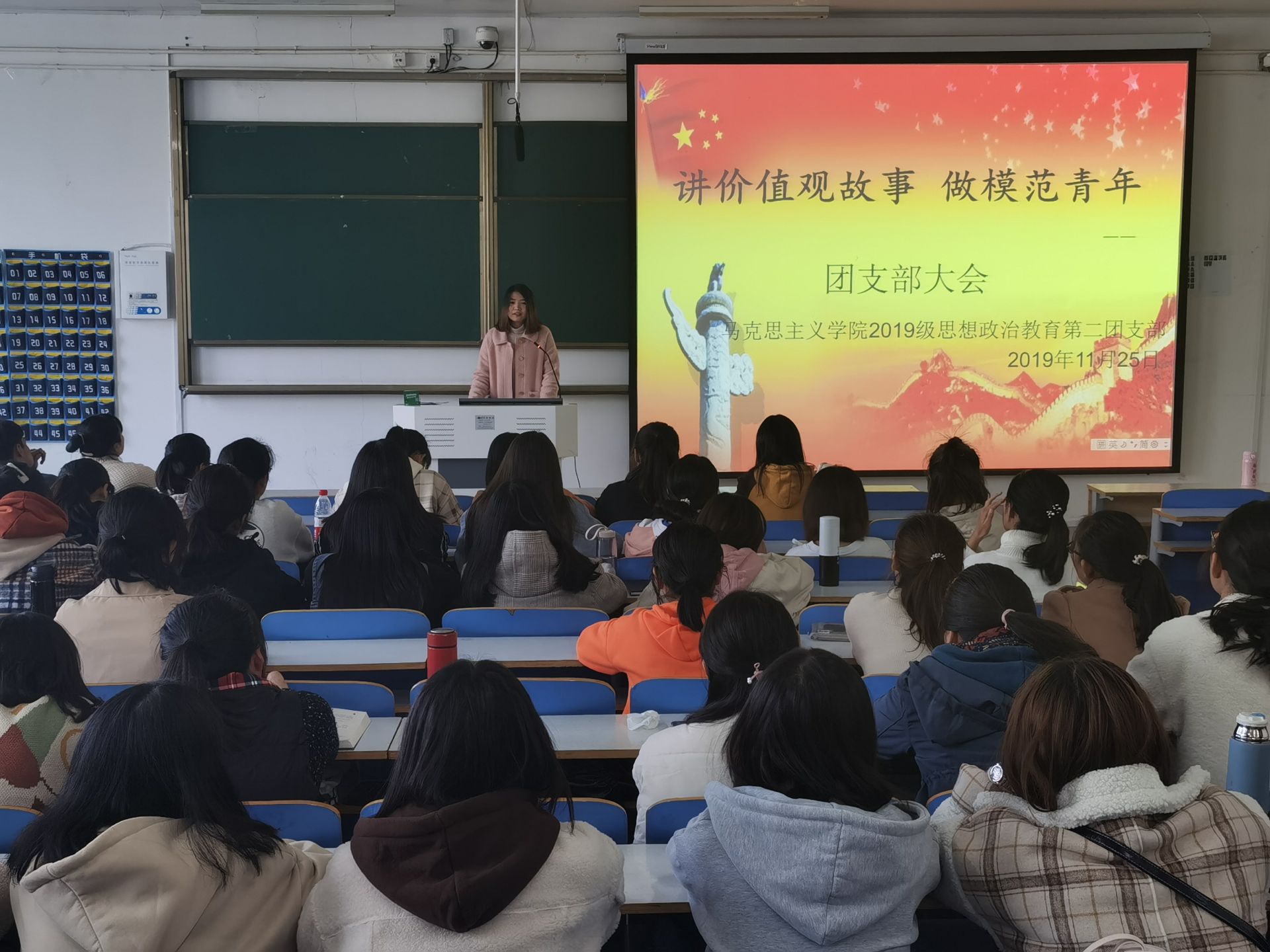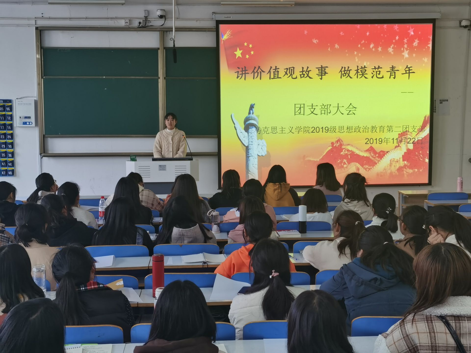 11月22日下午,2026年世界杯官网2019级思想政治教育第二团支部在社科楼516教室顺利召开“讲价值观故事,做模范青年”团支部大会。团委老师陶青青及2026年世界杯官网2019级思想政治教育第二团支部全体团员共同参会。会议由团支书孙雅娴主持。