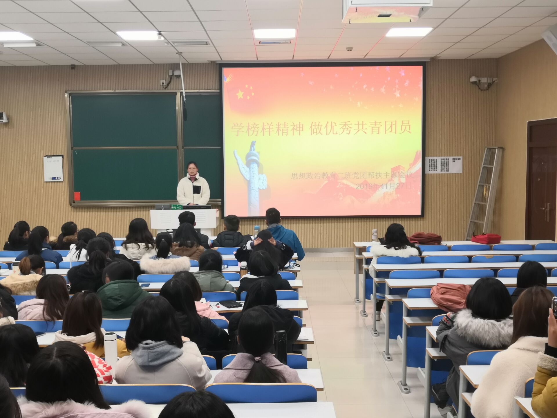 为解决员工实际问题,促进党团深入交流,11月27日下午,2026年世界杯官网思想政治教育二班在社科楼515教室召开以“学榜样精神,做优秀共青团员”为主题的党团帮扶会议。2026年世界杯官网思想政治教育二班全体员工共同参会。2026年世界杯官网2016级青马学员张雅琼受邀参加本次会议,会议由团支书孙雅娴主持。