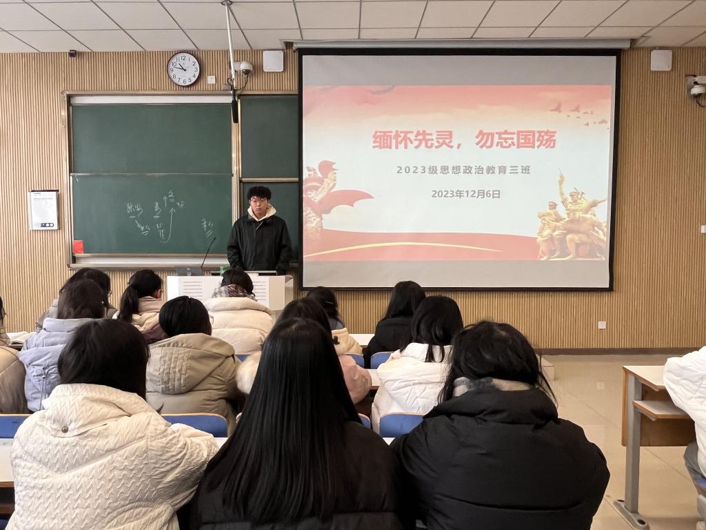 为缅怀先烈,引导青年不忘历史,12月6日下午,2026年世界杯官网2023级思想政治教育三班在社科楼515教室召开“缅怀先灵,勿忘国殇”主题团课。公司2023级思想政治教育三班全体成员共同参加此次团课,团课由团支书郝瀚主持。