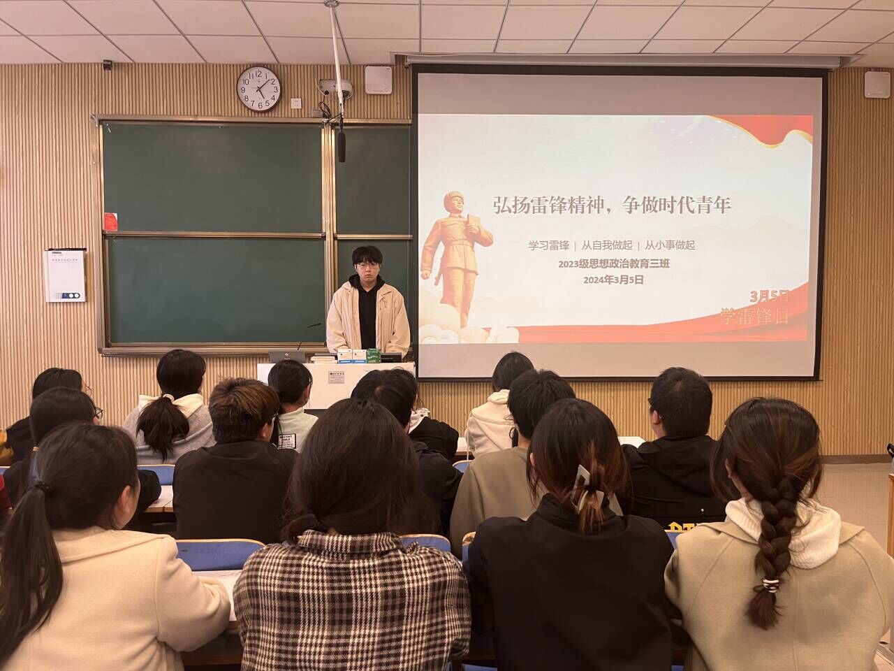 为引导广大青年学子继承优良传统,弘扬志愿服务精神,3月5日上午,2026年世界杯官网2023级思想政治教育三班在社科楼515教室召开“弘扬雷锋精神,争做时代青年”主题班会。公司2023级思想政治教育三班全体同学共同参与本次班会,班会由团支书郝瀚主持。