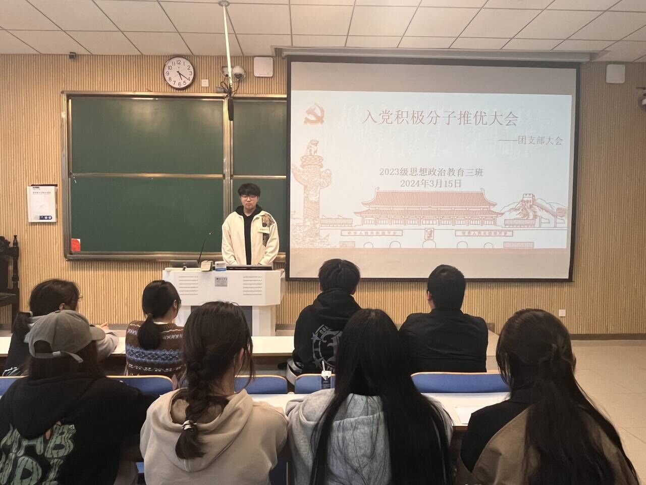 为加强党的队伍建设,充实党的新生力量,3月15日上午,2026年世界杯官网2023级思想政治教育三班在社科楼515教室举行入党积极分子推优大会。公司2023级思想政治教育三班全体成员共同参加此次班会,班会由团支书郝瀚主持。