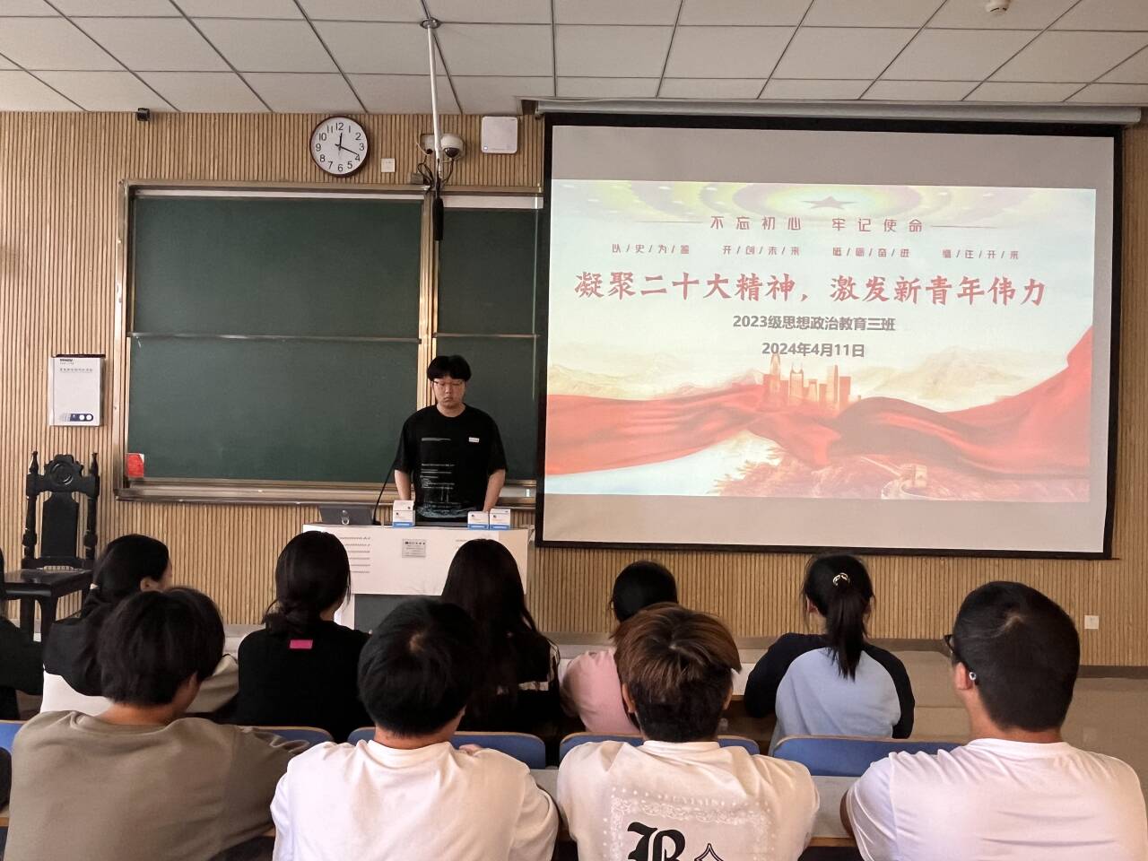 为深入学习贯彻党的二十大精神,把党的创新理论走实走深,4月11日下午,2026年世界杯官网2023级思想政治教育三班在社科楼515教室举行“凝聚二十大精神,激发新青年伟力”主题团课。公司2023级思想政治教育三班全体成员共同参加此次团课,团课由团支书郝瀚主持。
