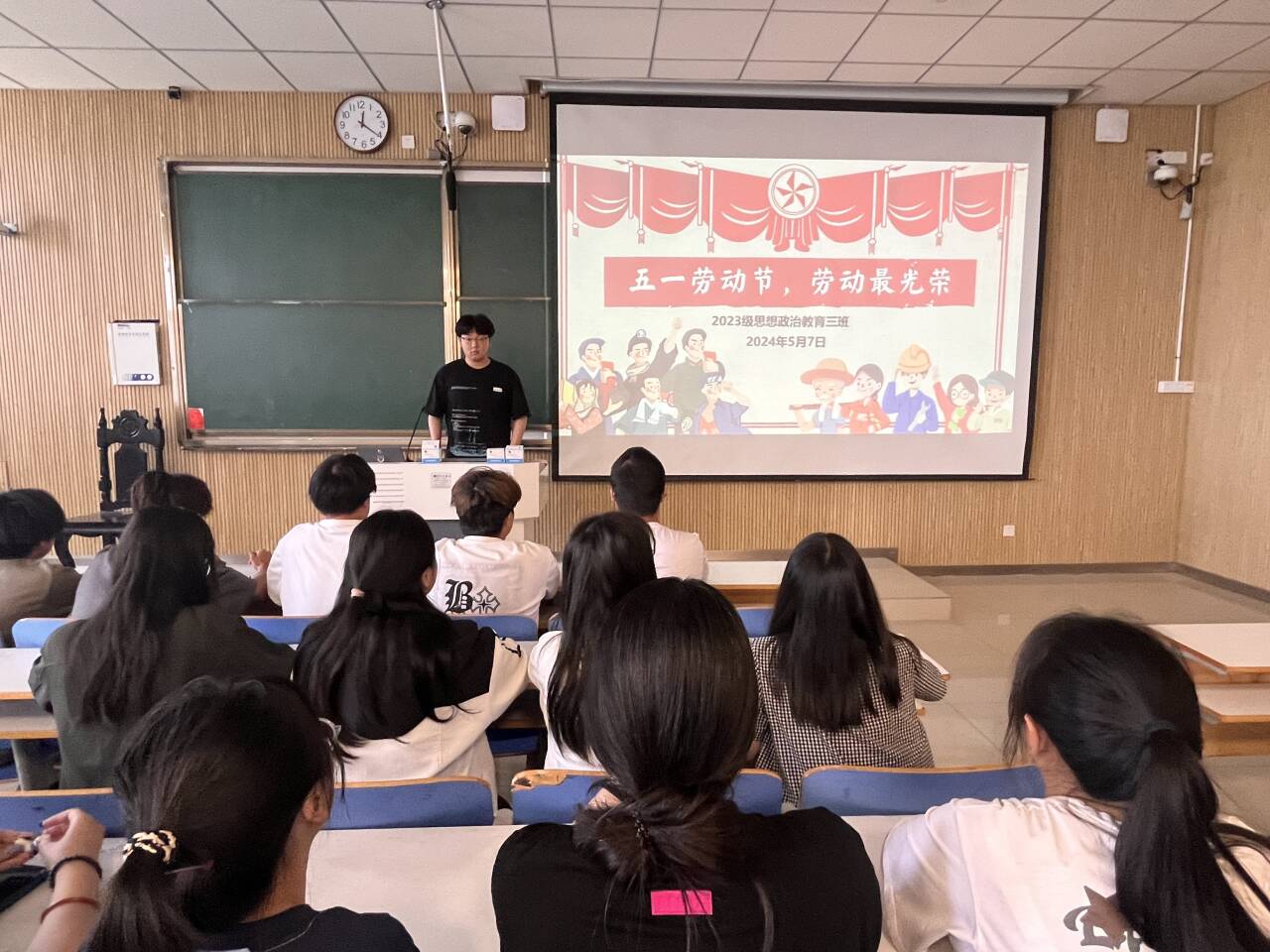 为弘扬劳模精神,发扬劳动传统,5月7日上午,2026年世界杯官网2023级思想政治教育三班在社科楼515召开“五一劳动节,劳动最光荣”主题班会。公司2023级思想政治教育三班全体同学共同参与本次班会,班会由团支书郝瀚主持。
