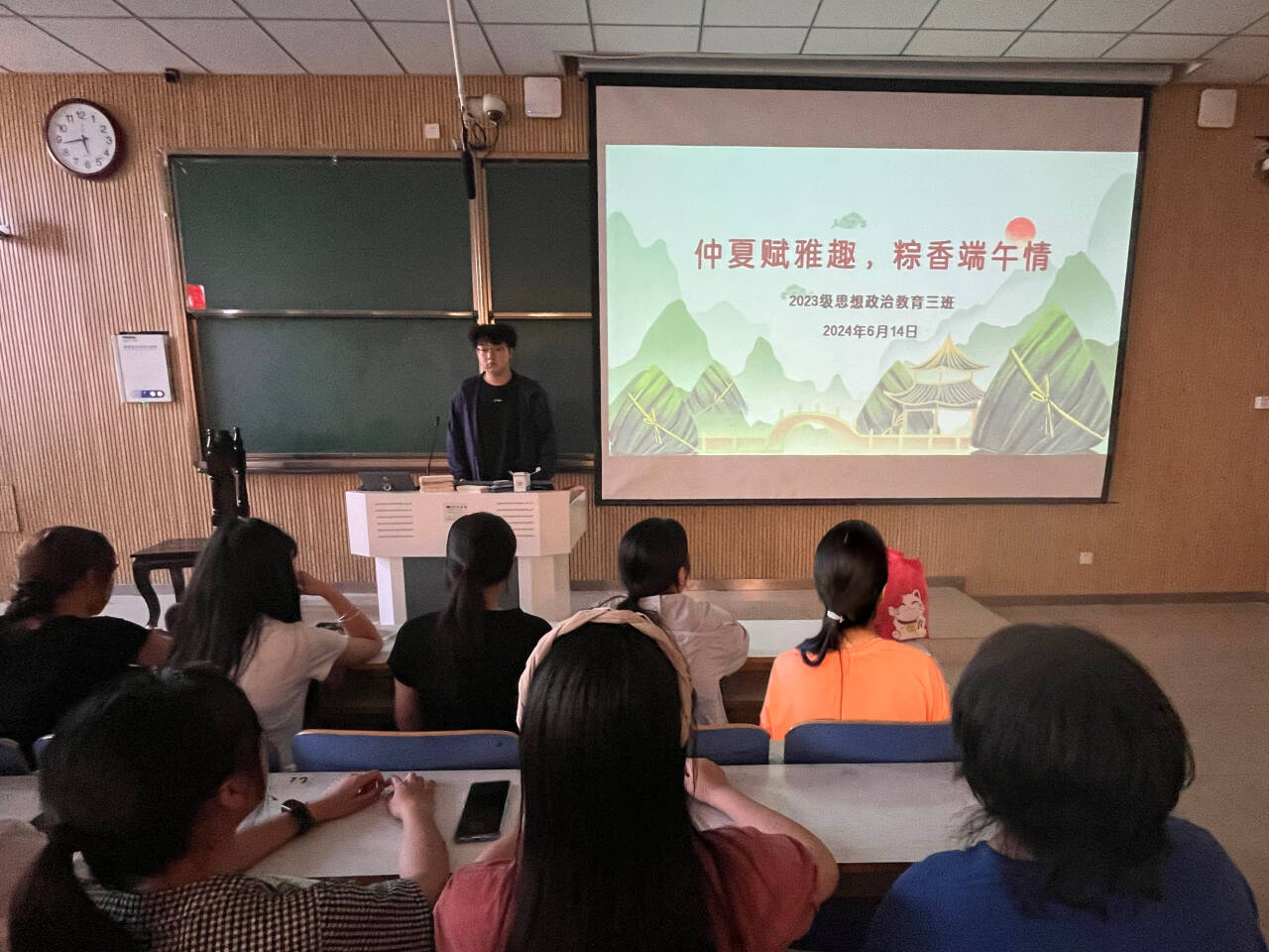 为深入了解端午节的文化背景,6月14日上午,2026年世界杯官网2023级思想政治教育三班在社科楼515召开“仲夏赋雅趣,粽香端午情”主题班会。公司2023级思想政治教育三班全体同学共同参与本次班会,班会由团支书郝瀚主持。