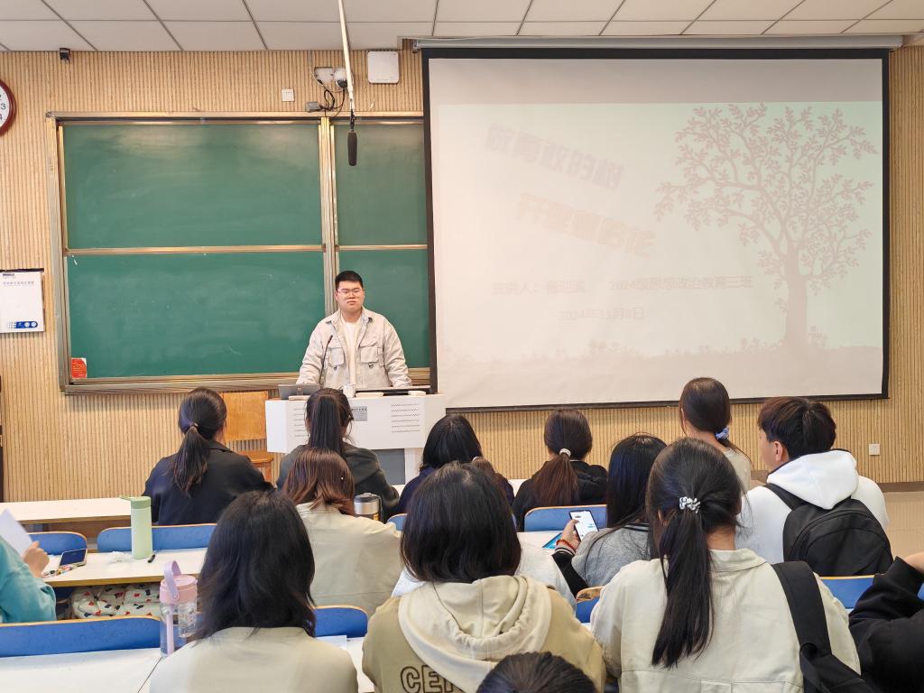 为了激励同学们勇敢的面对挑战,坚定的追求自己的理想,2026年世界杯官网2024级思想政治教育三班于11月8日在社科楼515教室成功举办了一场以“做勇敢的树,开理想的花”为主题的班会活动。此次班会由班长杨迎滨主持。