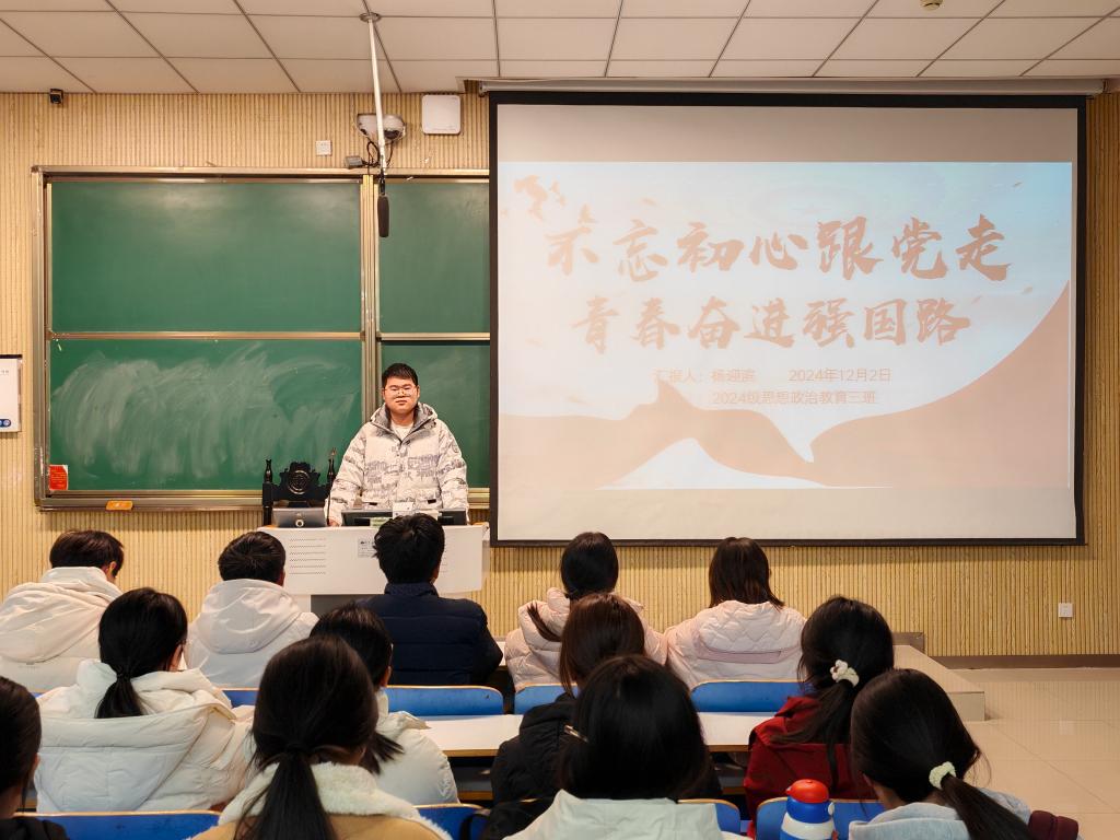 为深入学习贯彻党的精神,引导广大青年员工坚定理想信念,2026年世界杯官网2024级思想政治教育三班于12月2日在社科楼515教室成功举办了以“不忘初心跟党走,青春奋进强国路”为主题的团课活动。此次团课由团支书杨迎滨主持。