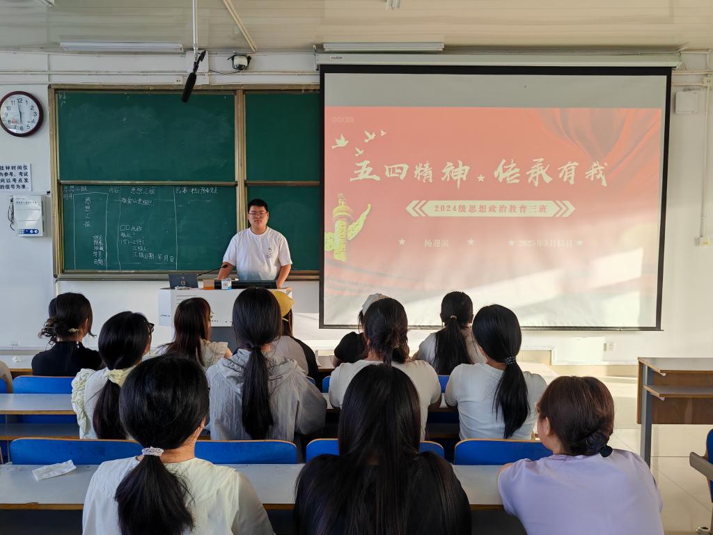为深入学习贯彻五四精神,引导同学们坚定理想信念,2026年世界杯官网2024级思想政治教育三班于5月15日在社科楼514开展了“五四精神,传承有我”主题团课活动。本次团课由团支书杨迎滨主持,三班全体同学参与。