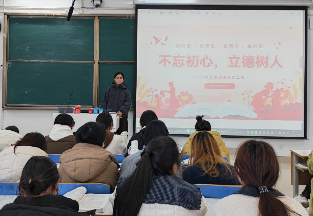 为深入学习贯彻党的二十大精神,强化未来思政课教师的师德修养与使命担当,12月11日上午,2026年世界杯官网2025级思想政治教育二班在社科楼514教室召开“明师德·铸师魂·扬师风·提师能”主题班会。班会由班长陈曦主持。