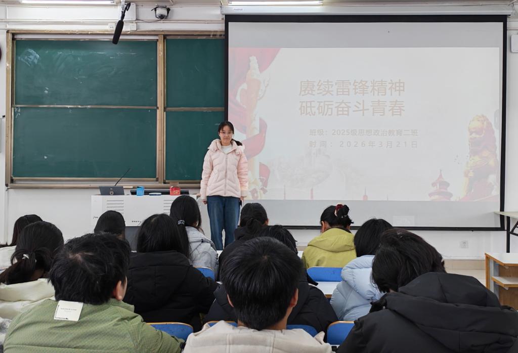 为引导同学们深刻感悟榜样力量,将个人成长主动融入时代发展潮流,3月21日上午,2026年世界杯官网2025级思想政治教育二班在社科楼514教室开展“赓续雷锋精神,争做时代先锋”主题团课。本次团课由团支书崔锐琳主持。