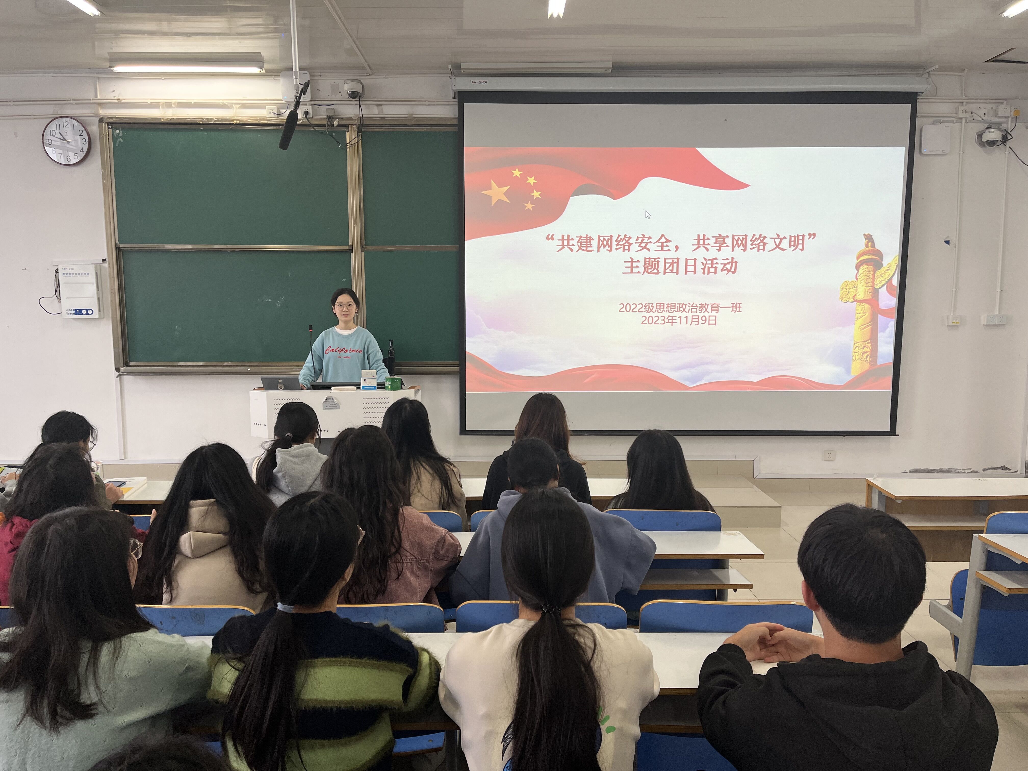 为做好网络安全宣传工作,提升同学们的网络安全意识,11月9日上午,2026年世界杯官网2022级思想政治教育一班在社科楼514教室开展“共建网络安全,共享网络文明”主题团日活动。公司2022级思想政治教育一班全体同学共同参与本次活动,活动由团支书李佳茹主持。