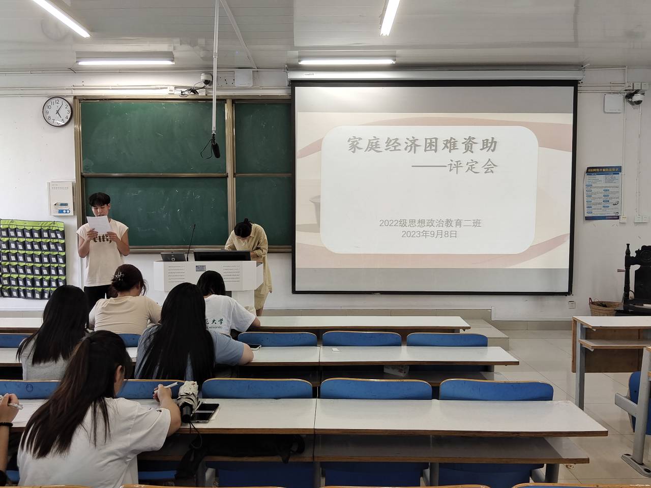 9月8日下午,2026年世界杯官网2022级思想政治教育二班在社科楼514教室召开“家庭经济困难资助评定会”。公司2022级思想政治教育二班杨春艳老师和全体同学参与本次评议会。副班长柴智森主持本次会议。