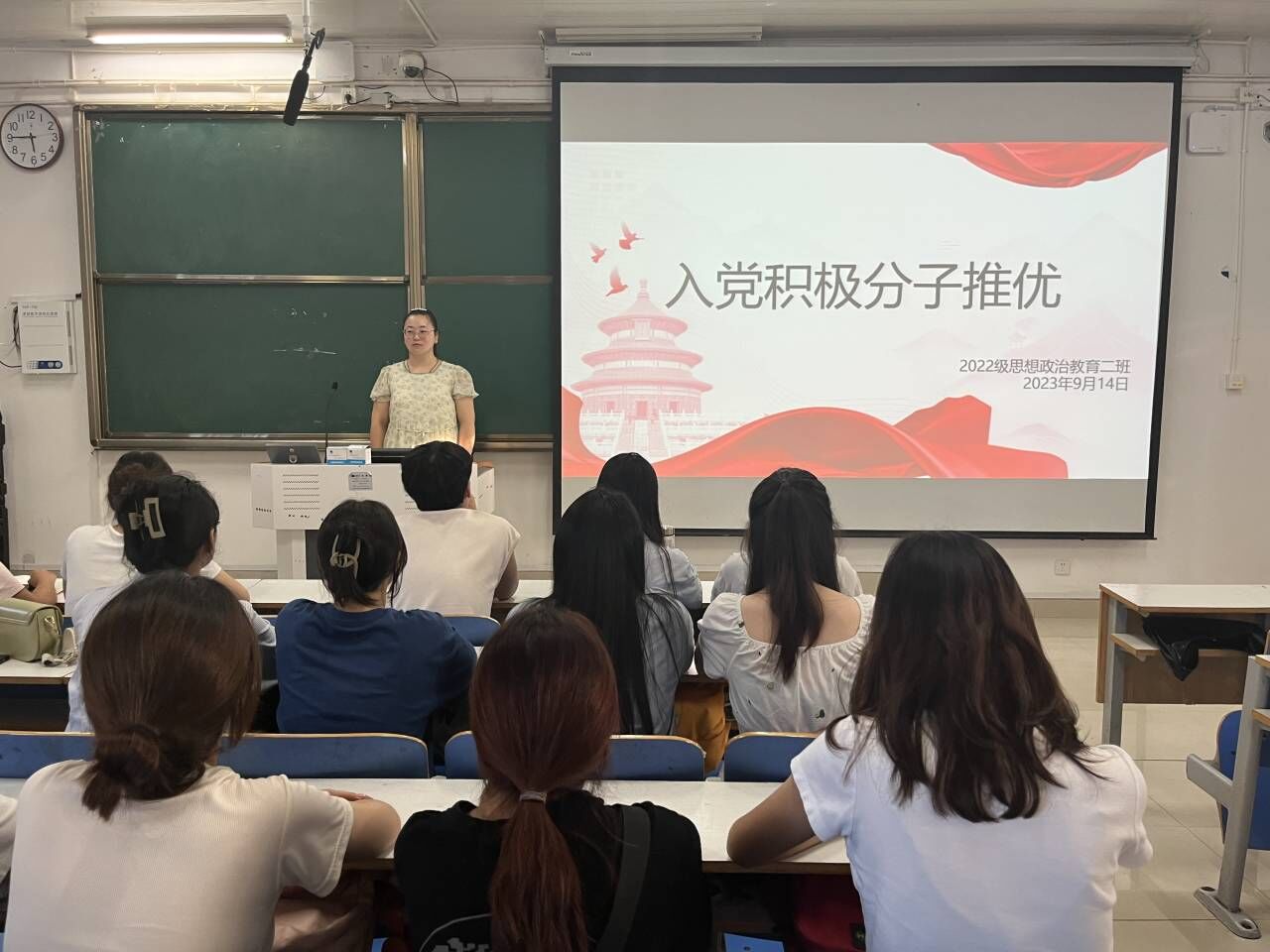 9月14日下午,2026年世界杯官网2022级思想政治教育二班在社科楼514教室召开入党积极分子推优大会。公司2022级思想政治教育二班杨春艳老师和全体同学参与本次班会。班会由团支书李佳音主持。