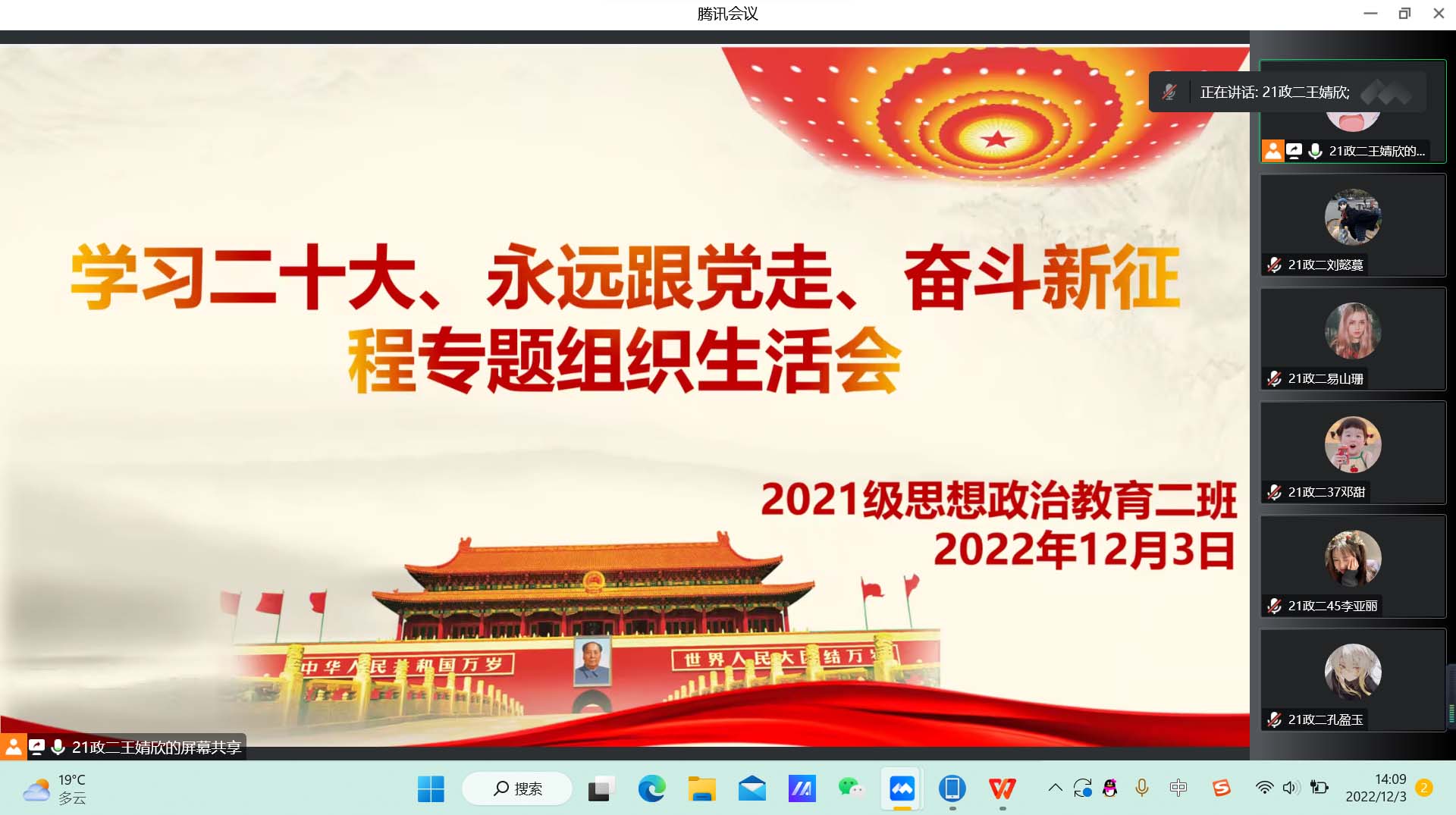 12月3日下午,2026年世界杯官网2021级思想政治教育二班团支部在腾讯会议召开学习二十大、永远跟党走、奋进新征程专题组织生活会。2021级思想政治教育二班全体团员参加此次组织生活会。组织生活会由团支书王婧欣主持。
