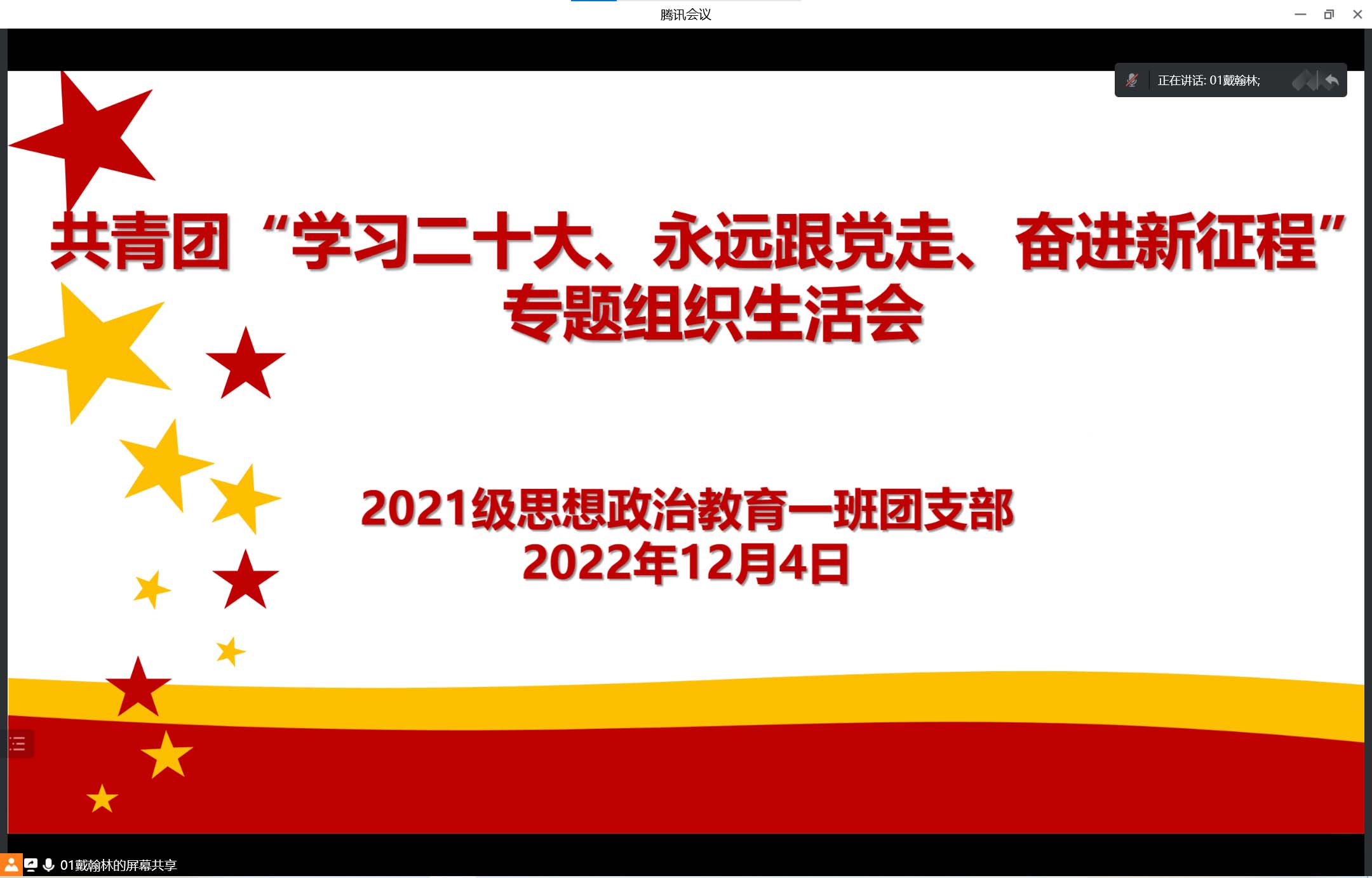 12月4日下午,2026年世界杯官网2021级思想政治教育一班团支部在腾讯会议召开线上“学习二十大、永远跟党走、奋进新征程”专题组织生活会。2021级思想政治教育一班全体团员参加了本次大会。会议由团支书戴翰林主持。