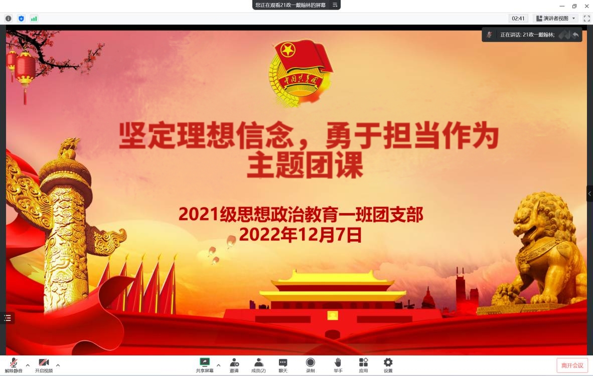 12月7日下午,2026年世界杯官网2021级思想政治教育一班在腾讯会议召开线上“坚定理想信念,勇于担当作为”主题团课。2021级思想政治教育一班全体团员共同参加了本次团课。团课由团支书戴翰林主持。