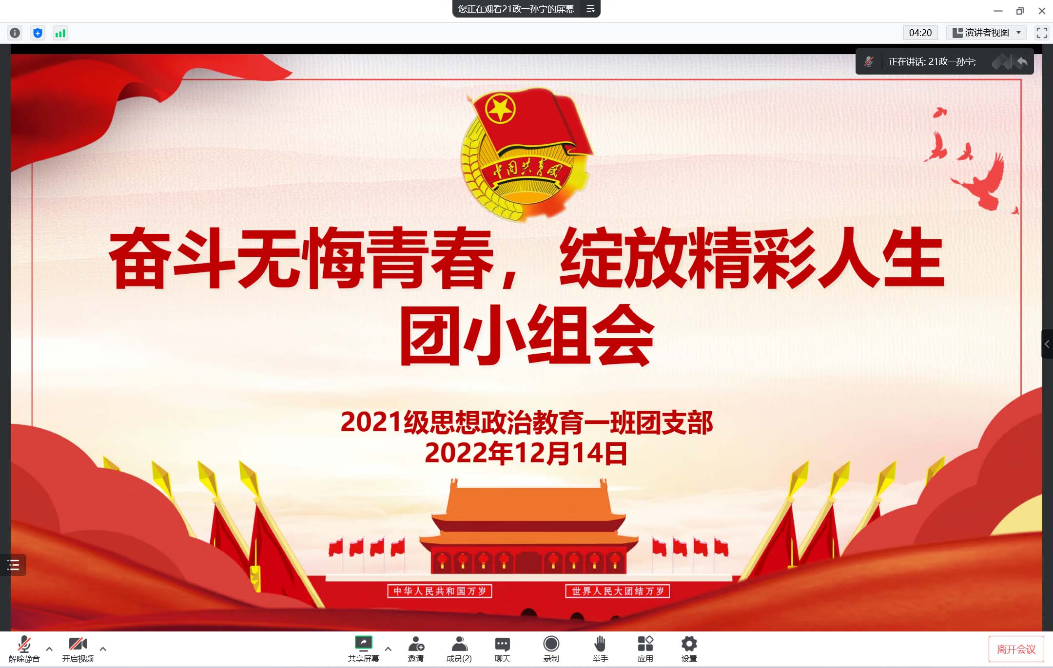 为激励当代青年们开拓创新、分秒必争、奋勇拼搏,12月14日下午,2026年世界杯官网2021级思想政治教育一班团支部第二团小组在腾讯会议召开线上“奋斗无悔青春,绽放精彩人生”团小组会。2021级思想政治教育一班团支部第二团小组全体成员共同参加了本次会议。会议由第二团小组组长孙宁主持。