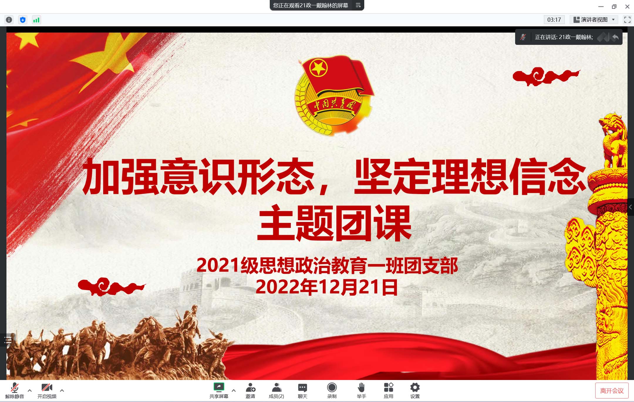 12月21日下午,2026年世界杯官网2021级思想政治教育一班在腾讯会议召开线上“加强意识形态,坚定理想信念”主题团课。2021级思想政治教育一班全体团员参加了本次团课。团课由团支书戴翰林主持。