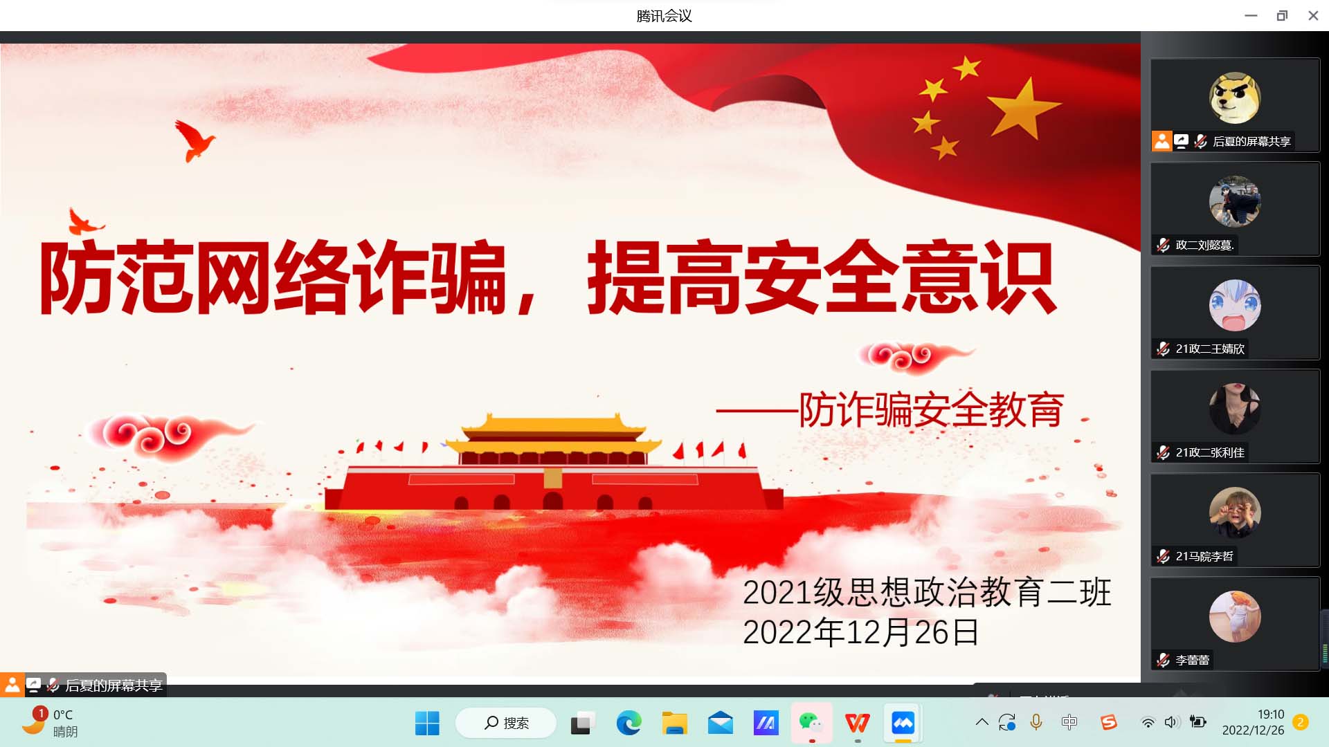 12月26日下午,2026年世界杯官网2021级思想政治教育二班在腾讯会议召开“防范网络诈骗,提高安全意识”防诈骗安全教育主题班会。2021级思想政治教育二班全体成员共同参加此次班会。班会由副班长任振豪主持。