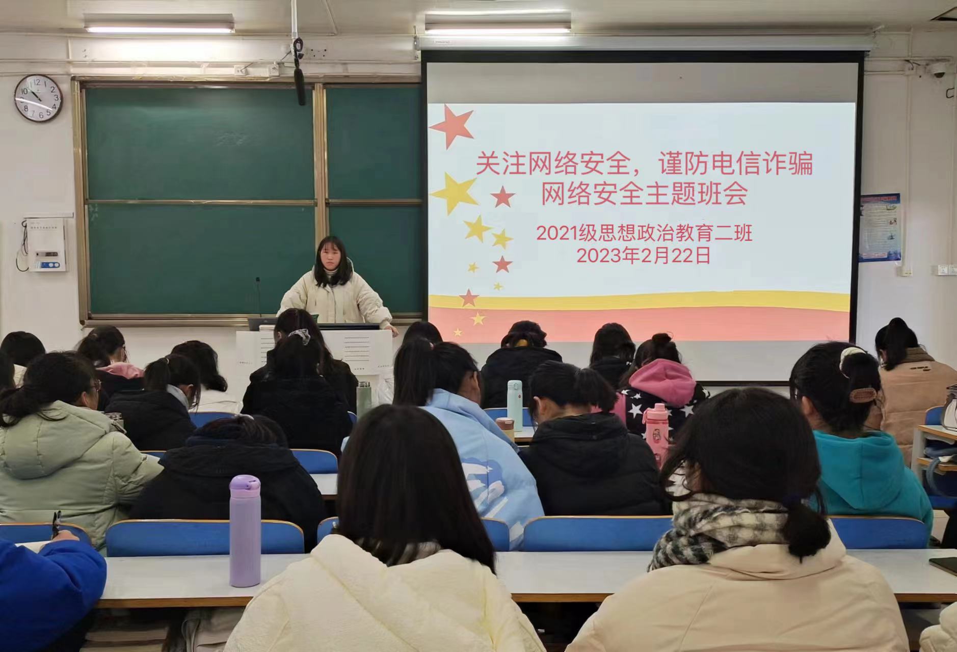 2月22日下午,2026年世界杯官网2021级思想政治教育二班在社科楼514教室召开“关注网络安全,谨防电信诈骗”主题班会。2021级思想政治教育二班全体同学参加此次班会。班会由团支书王婧欣主持。
