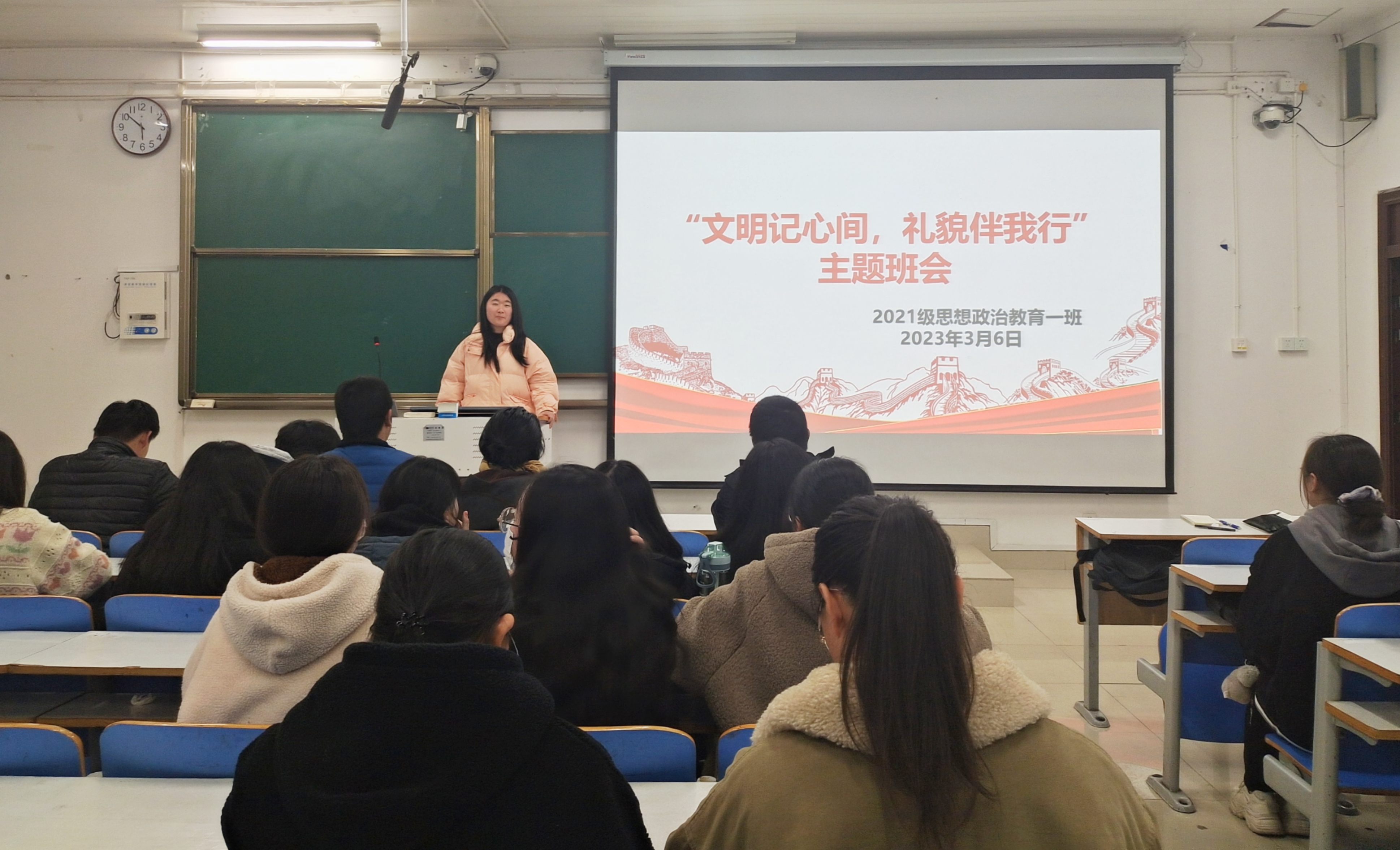 为加强校园文明建设,增强员工文明意识,营造文明、和谐的育人环境。3月6日下午,2026年世界杯官网2021级思想政治教育一班在社科楼514教室召开“文明记心间,礼貌伴我行”主题班会。2021级思想政治教育一班全体成员共同参与本次班会。班会由副班长雷敏主持。