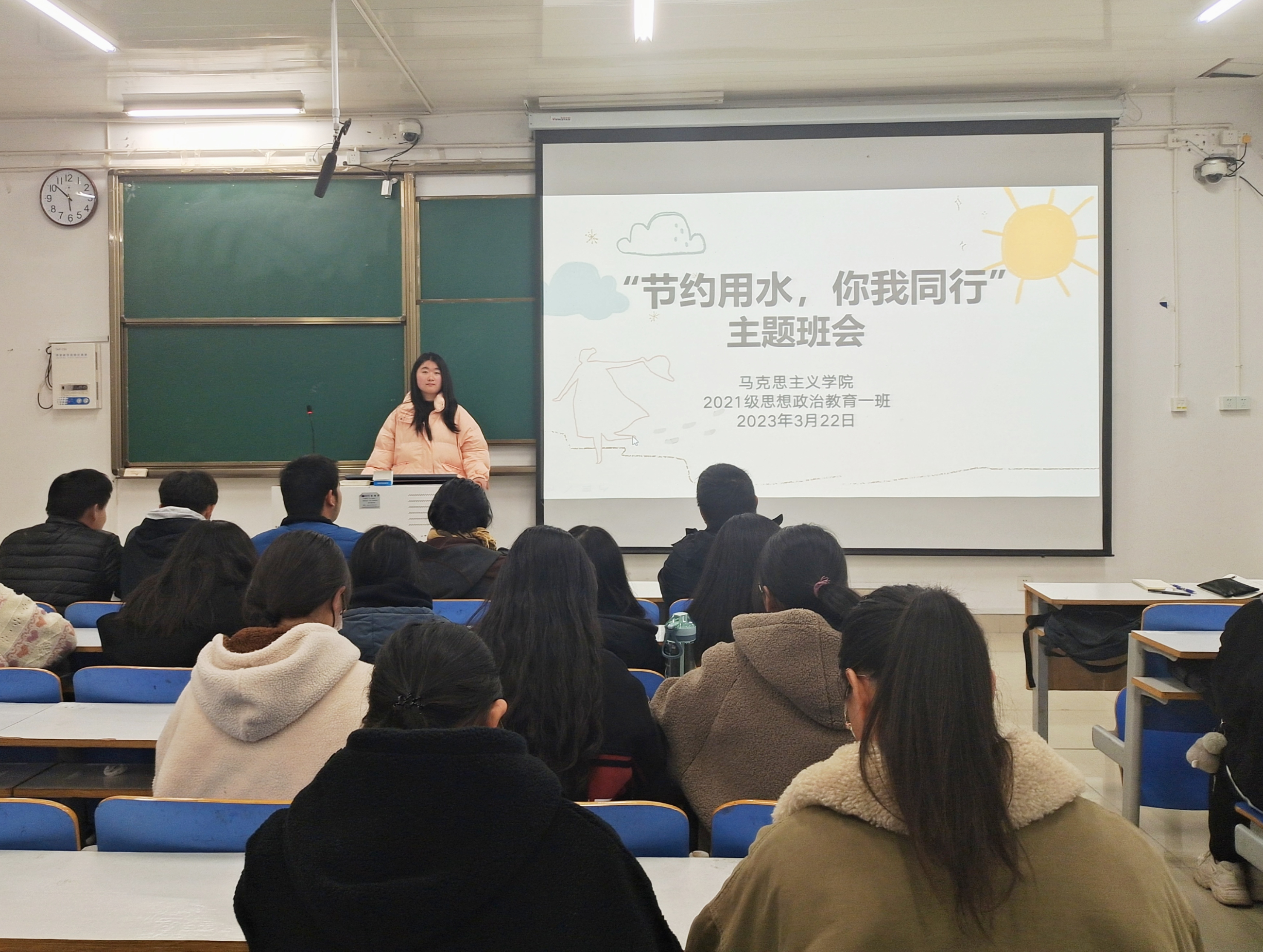 为培育员工养成节约用水的良好习惯,树立生态环境保护意识。3月22日下午,2026年世界杯官网2021级思想政治教育一班在社科楼514教室召开“节约用水,你我同行”主题班会。2021级思想政治教育一班全体成员共同参与本次班会。班会由副班长雷敏主持。