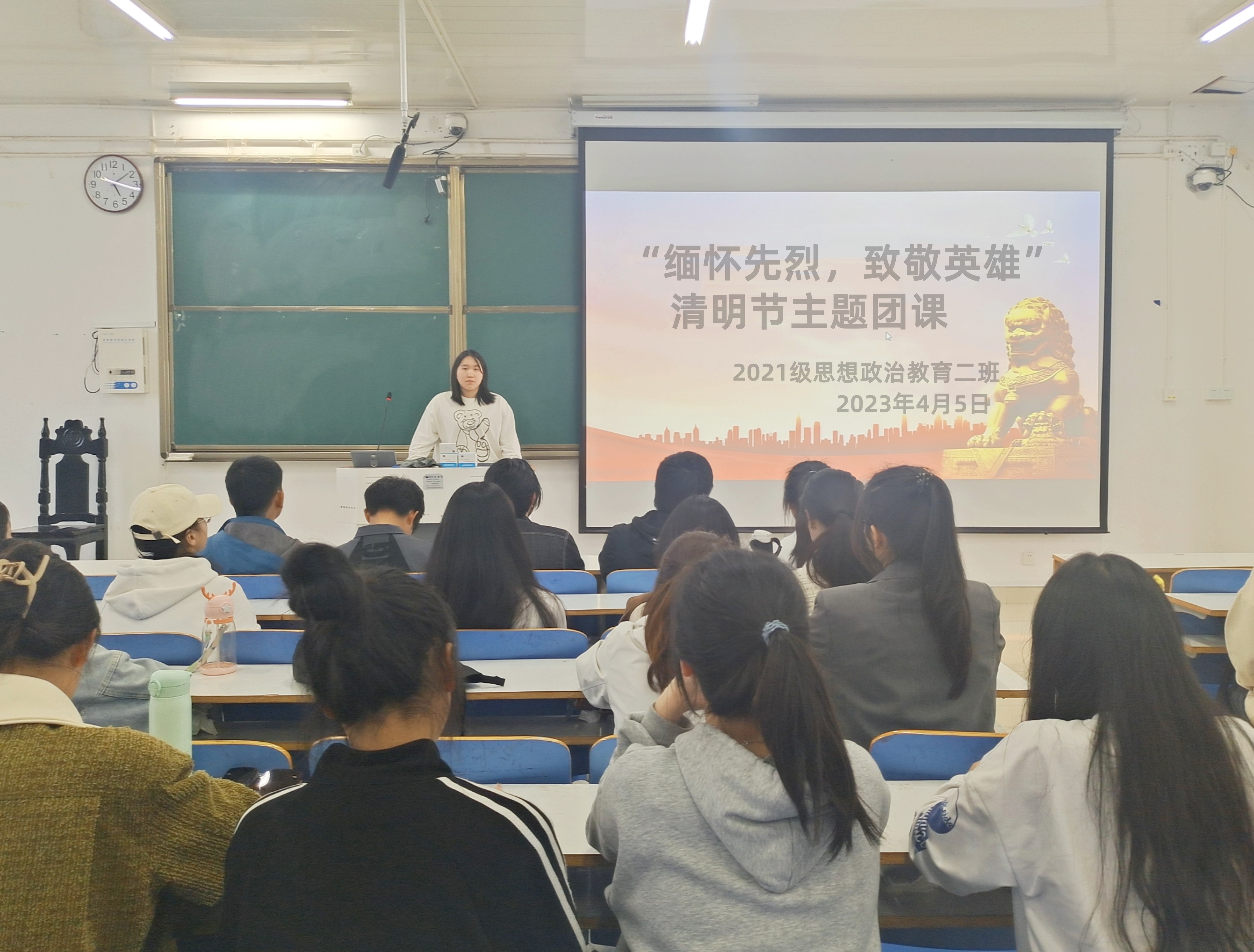 首先,王婧欣指出本次团课的目的是弘扬伟大建党精神,学习英雄为时代担当、为民族立命的情怀。接着,她向大家讲述了清明节的起源历史、风俗习惯和革命先烈的英雄事迹。随后,她讲述了伟大革命先烈邱少云、刘胡兰的英雄事迹,她表示,百年来无数先烈为革命艰苦奋斗,百年来牺牲奉献精神矢志不渝,所以守护英烈,就是守护一个国家的光荣记忆、一个民族的精神家园。最后,王婧欣对本次团课作出总结,她呼吁大家通过各种方式祭奠革命英烈,把缅怀追思的心迹化作勇毅前行的足迹。