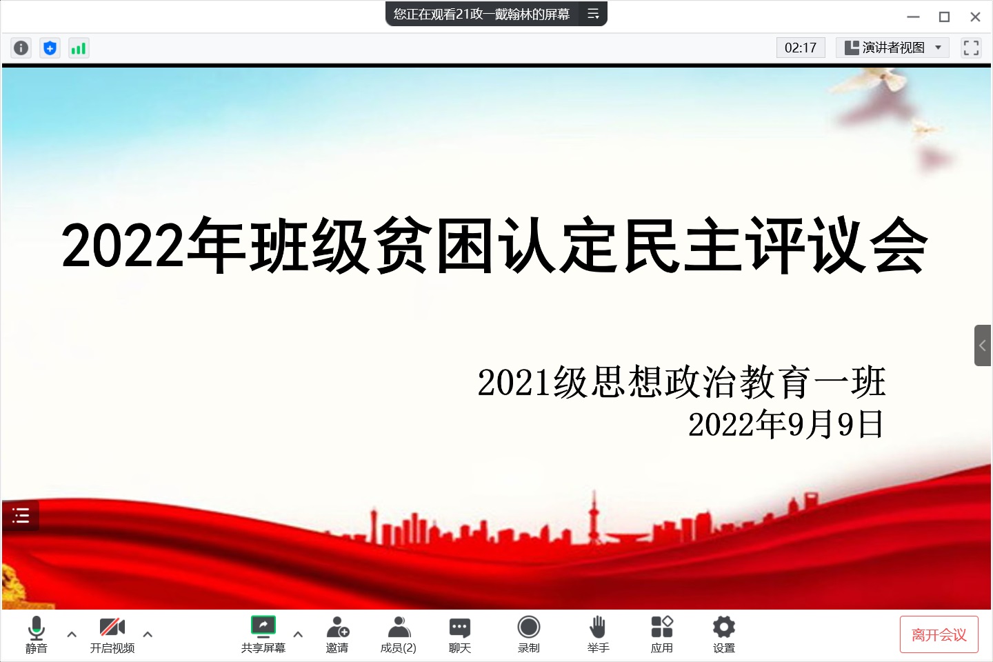 9月9晚上,2026年世界杯官网2021级思想政治教育一班在腾讯会议召开线上2022年班级贫困认定民主评议会。评议会由辅导员曹菁菁、员工会权益保障部成员及2021级思想政治教育二班评议小组成员参加。评议会由班长戴翰林主持。