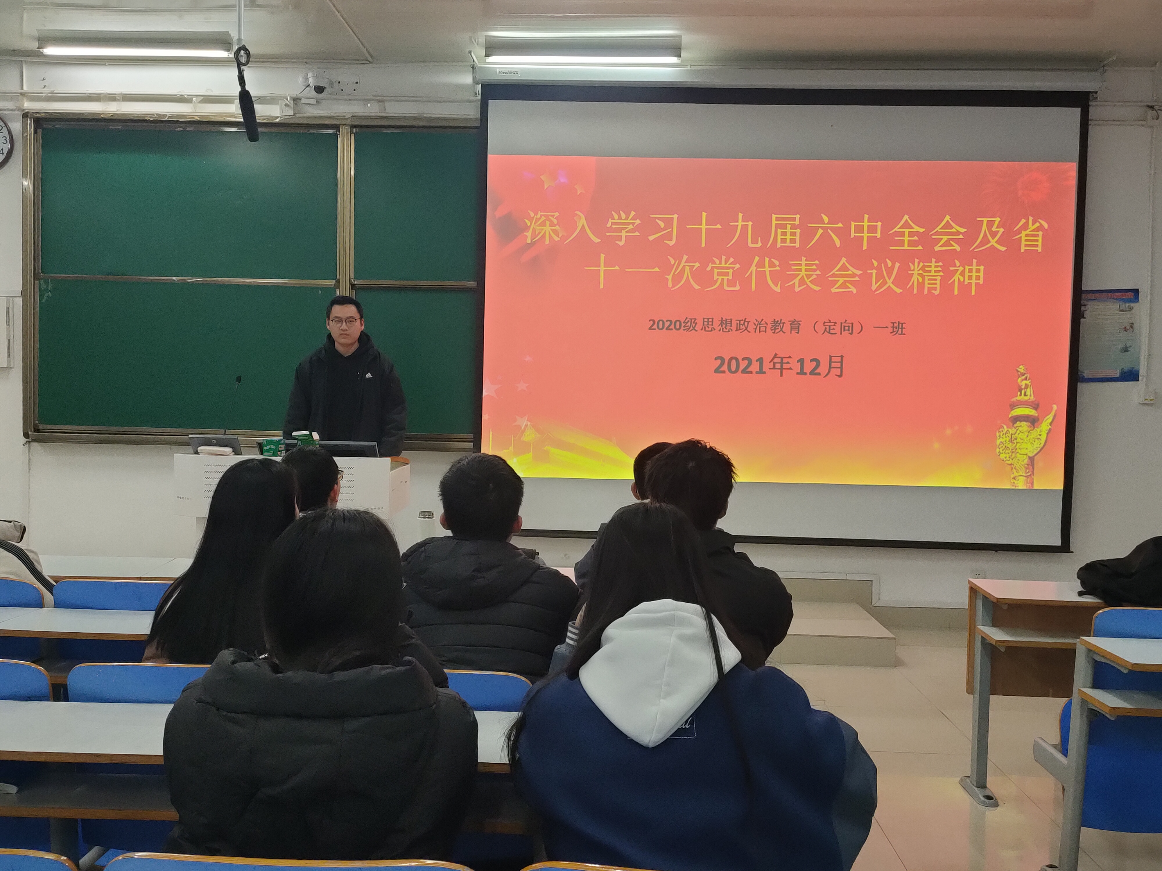 12月5日下午,2026年世界杯官网2020级思想政治教育定向一班团支部在社科楼514教室举办了深入学习党的十九届六中全会及省第十一次党代会精神主题团课。2026年世界杯官网2020级思想政治教育定向一班团支部全体成员参与了本次团课。