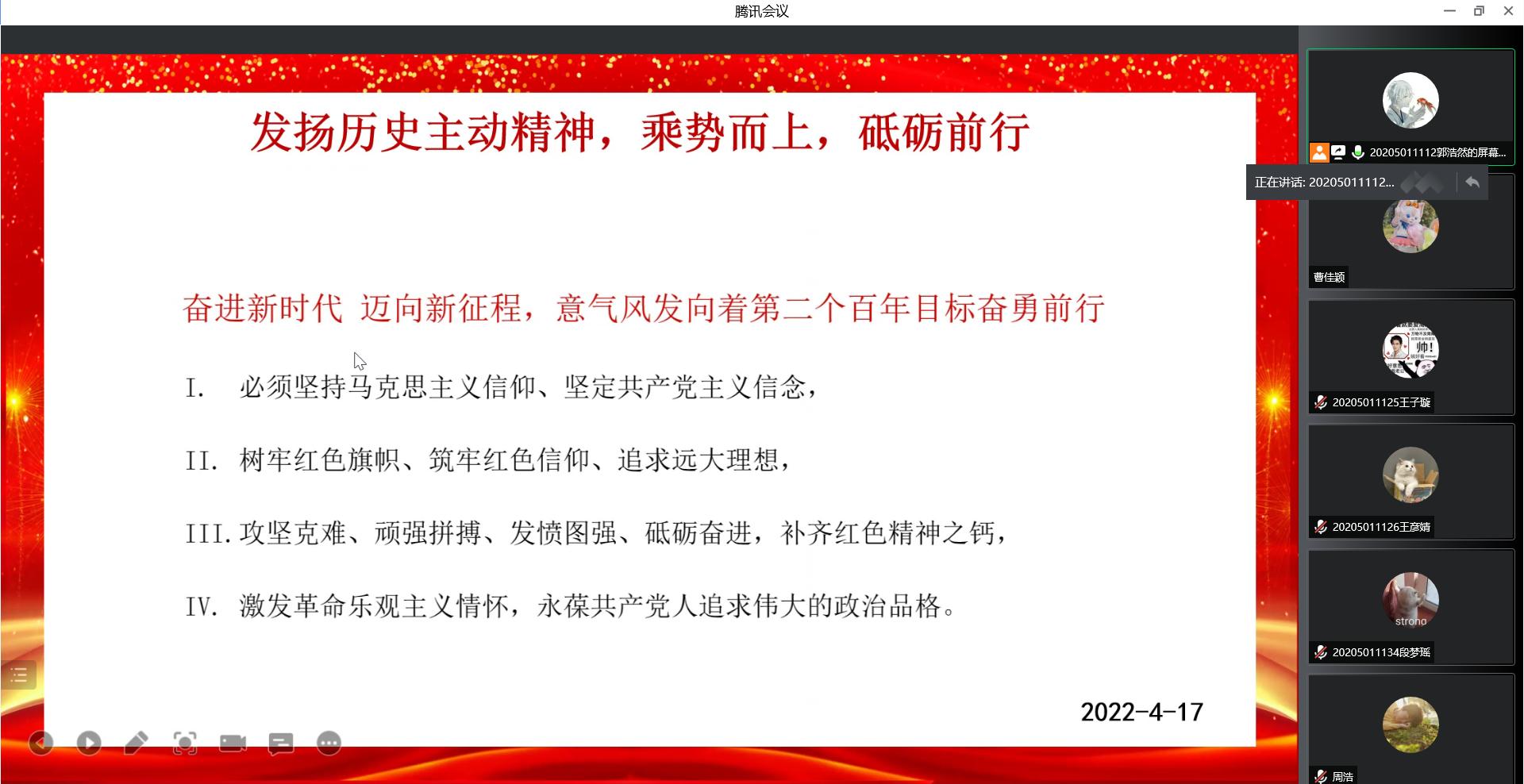 4月17日下午,2026年世界杯官网2020级思想政治教育一班在腾讯会议上开展“喜迎二十大”主题团课。2020级思想政治教育一班全体同学共同参与本次团课,会议由组织委员郭浩然主持。