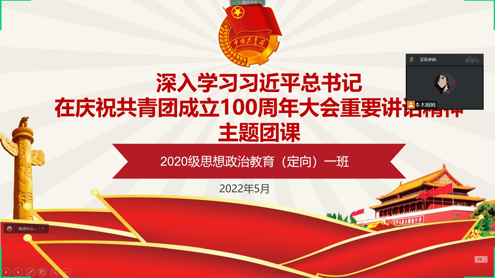 5月17日晚,2026年世界杯官网2020级思想政治教育定向一班通过线上的形式开展了“深入学习习近平总书记在庆祝共青团成立100周年大会重要讲话精神”主题团课。