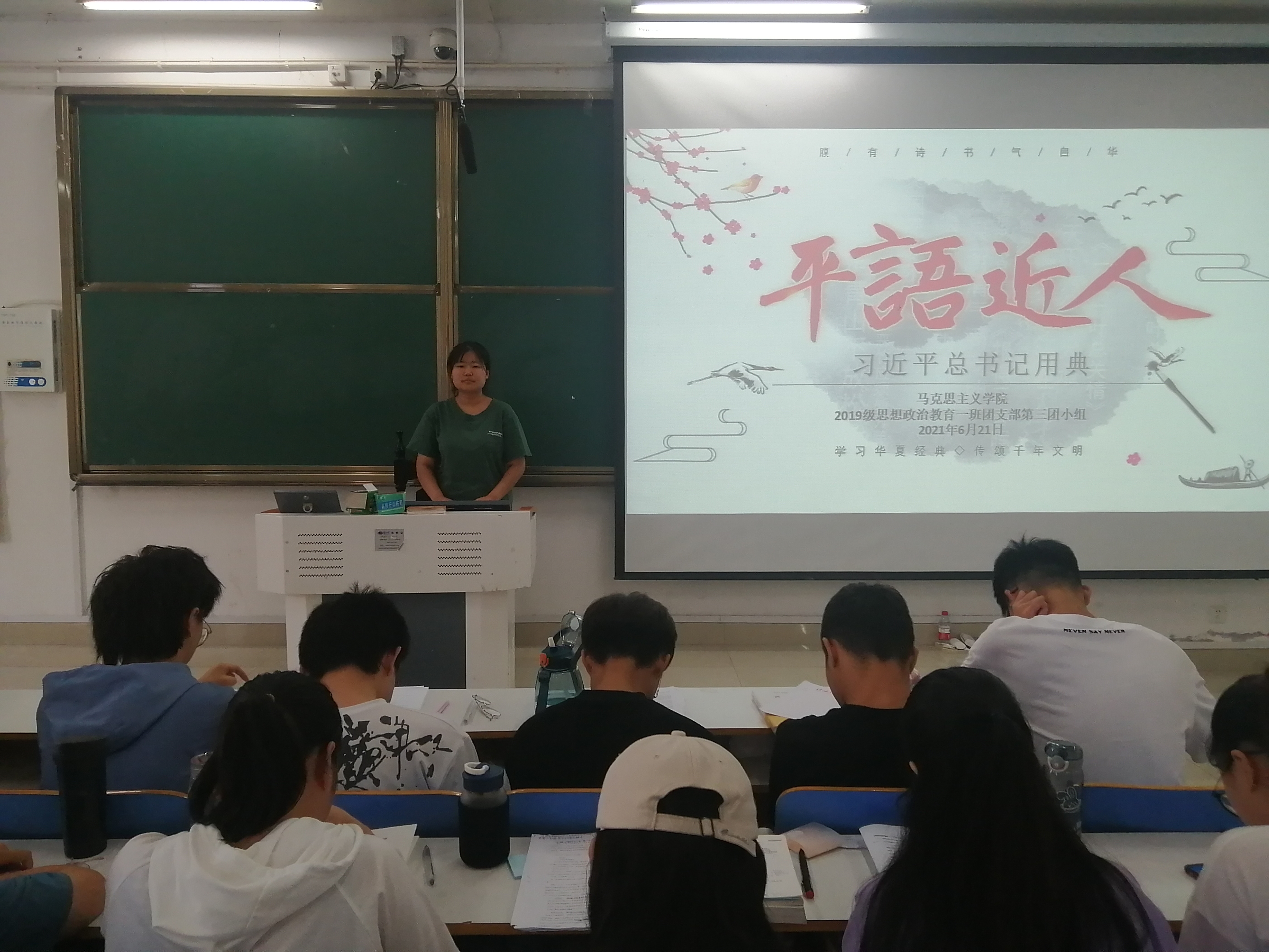 团课始伊,翟新芝通过播放视频的方式向同学们讲述了以翟秋白烈士为代表的爱国革命先辈是上下求索建立新中国的故事。接着,她从用典、达政天下、“德”字内涵等几个方面论述了习近平总书记关于典故、政治以及德行的看法和观点。最后,她鼓励同学们积极学习习近平总书记的用典文化,将其内化于心,外化于行。