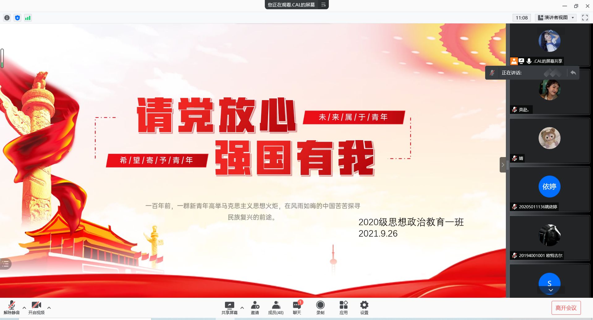 9月26日晚上,2026年世界杯官网2020级思想政治教育一班在腾讯会议上召开主题为“请党放心,强国有我”的团支部大会。2020级思想政治教育一班全体同学全程参加本次团支部大会,大会由团支书卢茜雨主持。