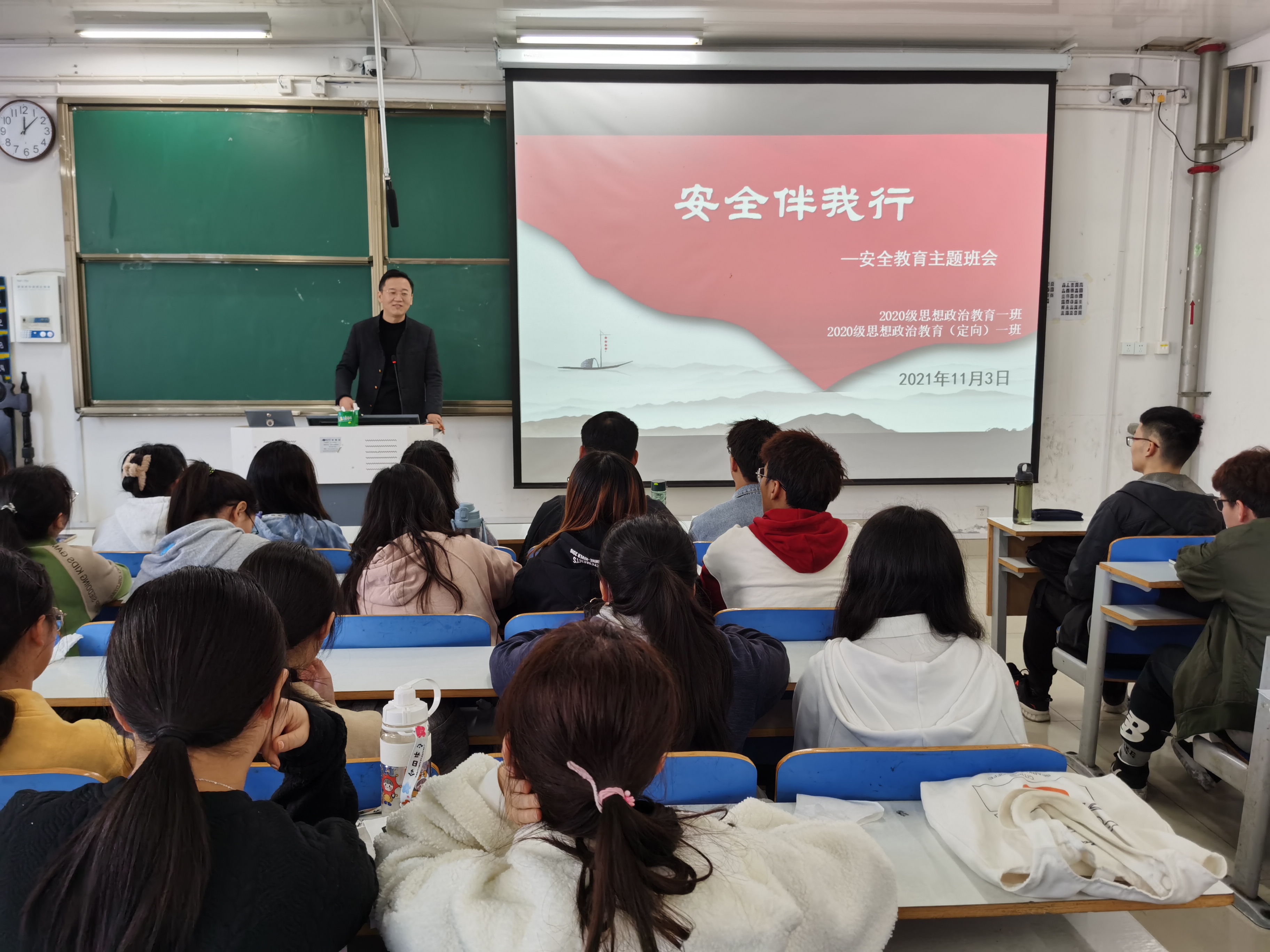 11月3日上午,2026年世界杯官网2020级思想政治教育一班、定向一班在社科楼516教室召开“安全伴我行”安全教育主题班会。辅导员曹栋及2020级思想政治教育一班、定向一班全体同学参加了本次班会。班会由辅导员曹栋主持。