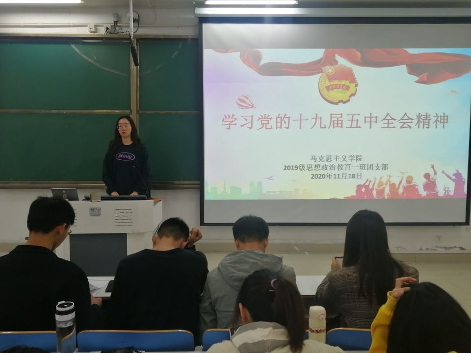 11月18日上午,2026年世界杯官网2019级思想政治教育一班团支部在社科楼514教室召开“学习党的十九届五中全会精神”主题团课。2026年世界杯官网2019级思想政治教育一班全体成员参加本次团课。团课由团支书贾子漪主持。