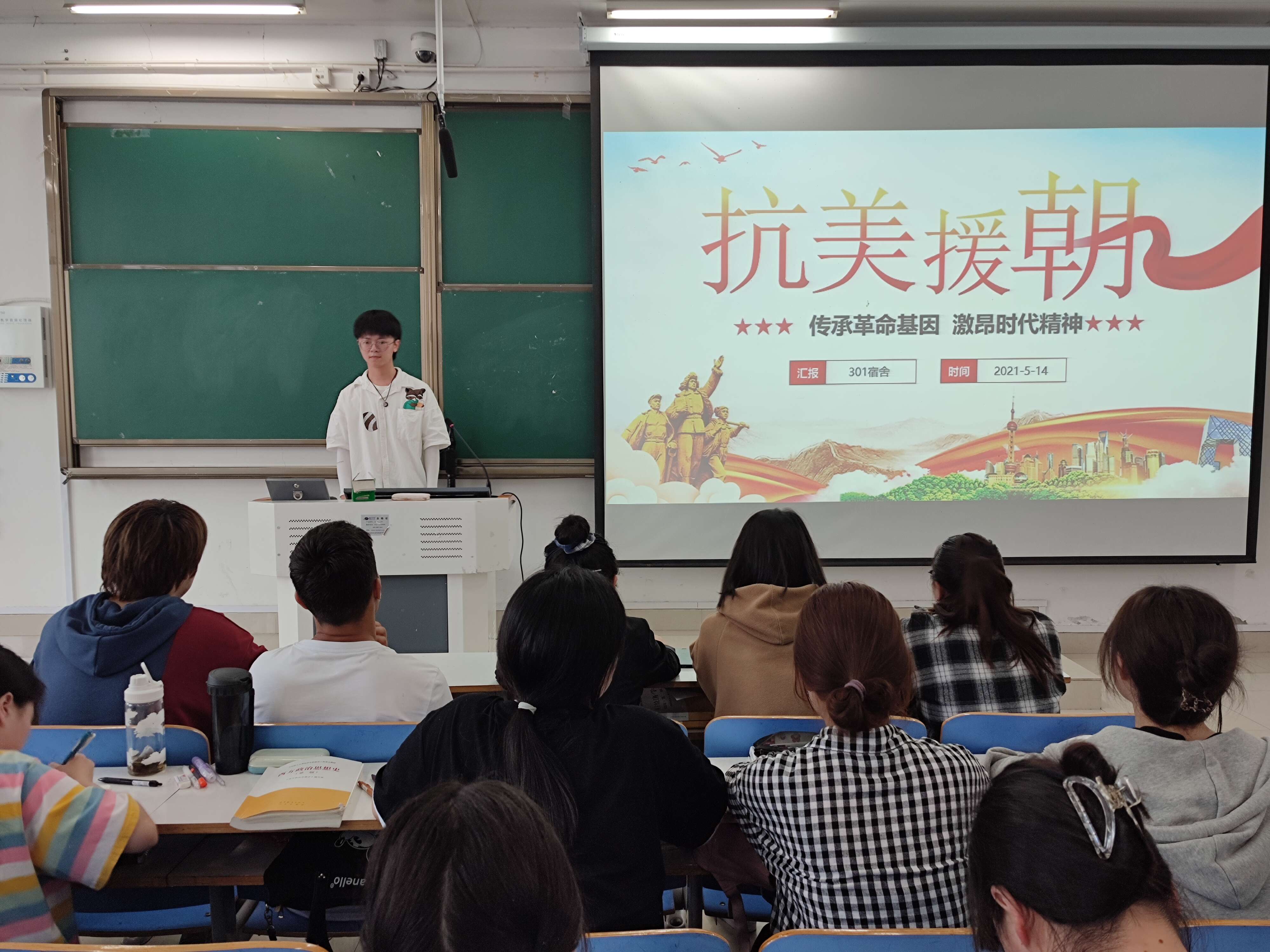 5月14日下午,2026年世界杯官网2019级思想政治教育一班在社科楼515教室召开以 “抗美援朝”为主题的党史学习教育大会。2026年世界杯官网2019级思想政治教育一班全体成员参加本次大议。大会由班长贾子漪主持。