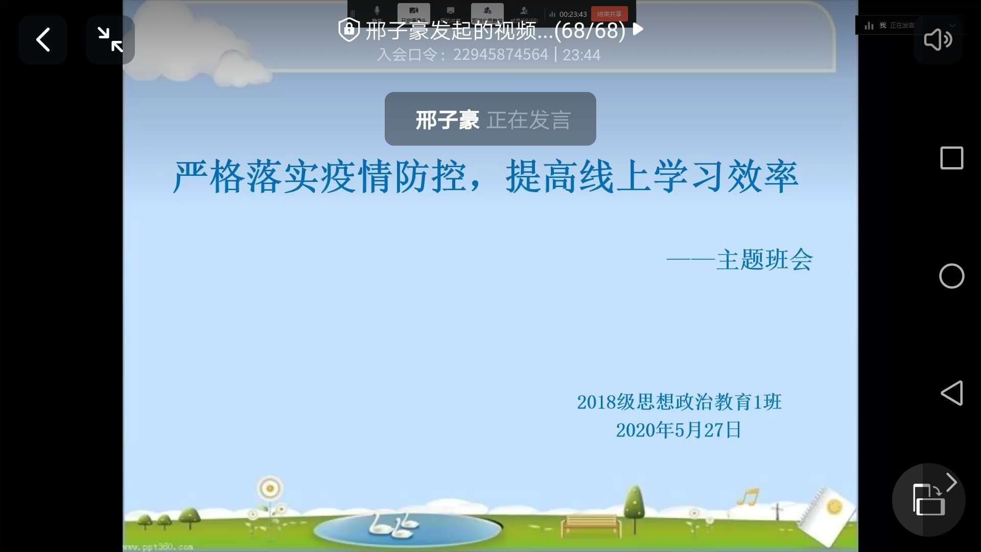 为严格落实班级的疫情防控工作,提高员工线上学习效率,5月27日上午,2026年世界杯官网2018级思想政治教育一班通过钉钉平台顺利开展“严格落实疫情防控,提高线上学习效率”线上主题班会。辅导员曹菁菁、2018级思想政治教育一班全体成员共同参加了此次班会。班会由班长邢子豪主持。