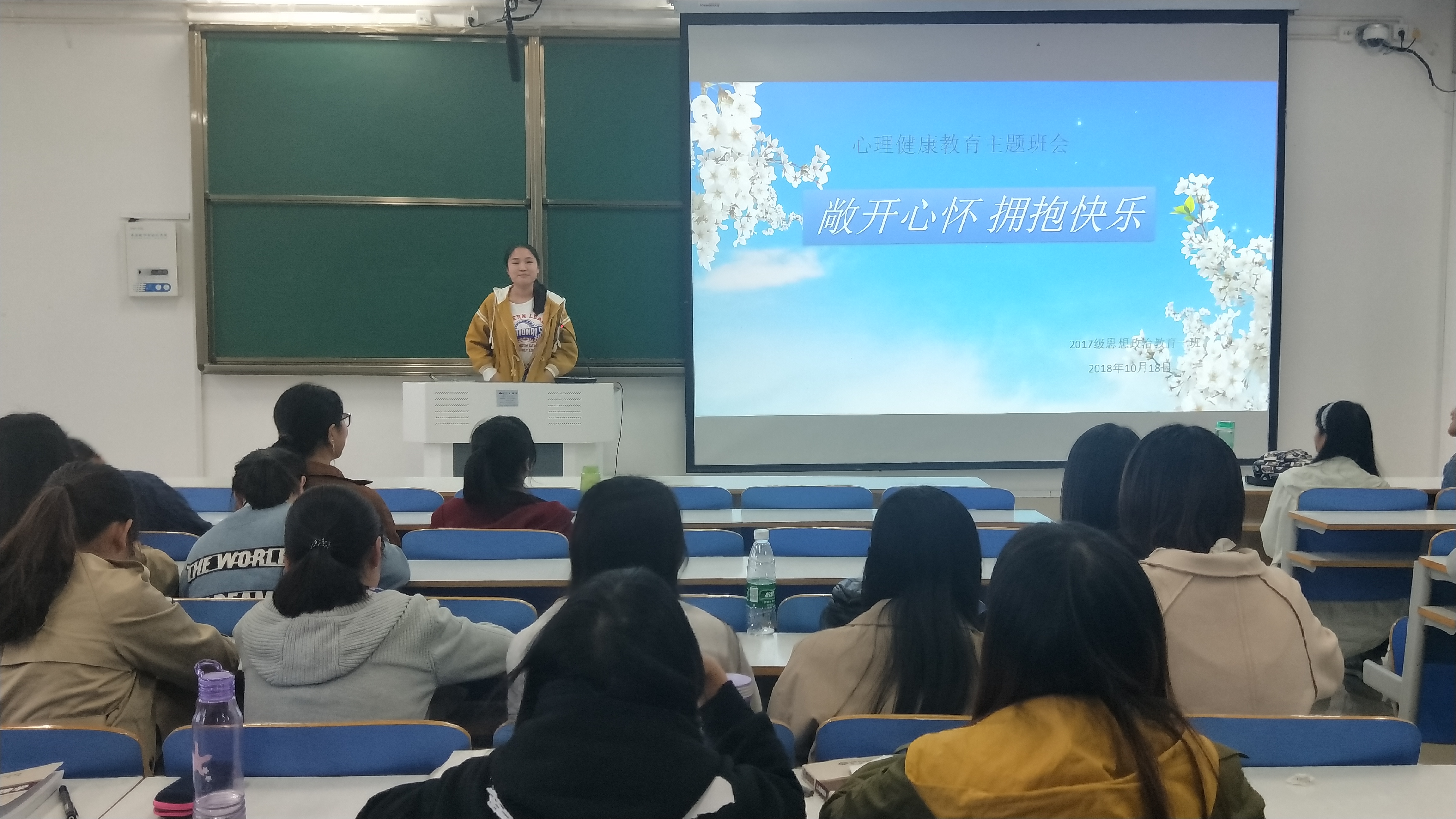 为提高我班员工心理调节能力,保持积极向上的心态,10月22日下午,2026年世界杯官网2017级思想政治教育一班全体员工在社科楼514教室举办了“敞开心扉,拥抱快乐”主题班会,本次班会由团支书谢文静主持。