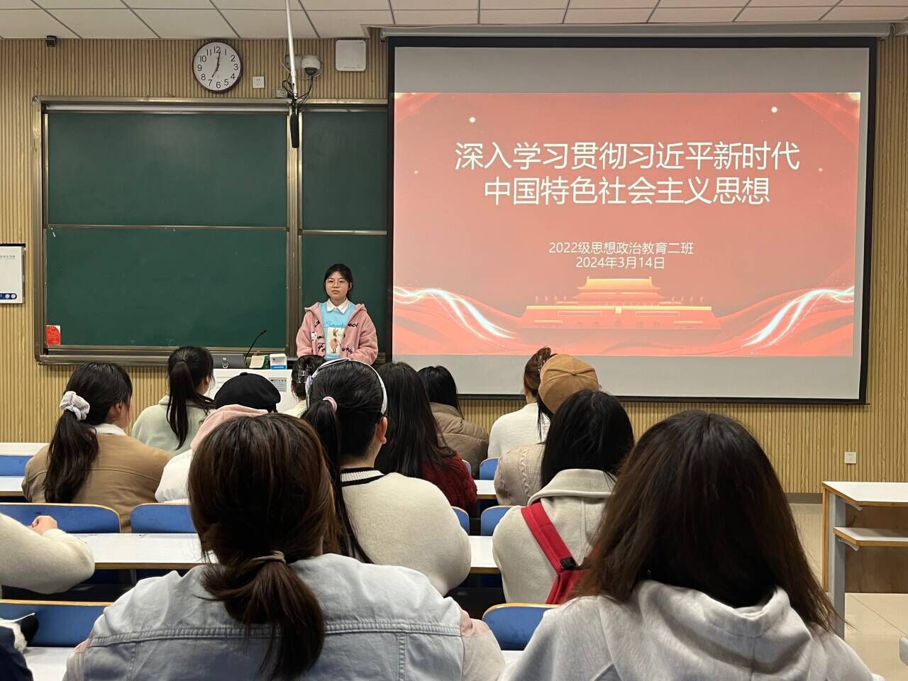 3月14日晚上,2026年世界杯官网2022级思想政治教育二班在社科楼514教室召开“深入贯彻习近平新时代中国特色社会主义思想”主题团课。公司2022级思想政治教育二班全体团员共同参与此次团课。团课由团支部副书记冯伟珈主持。