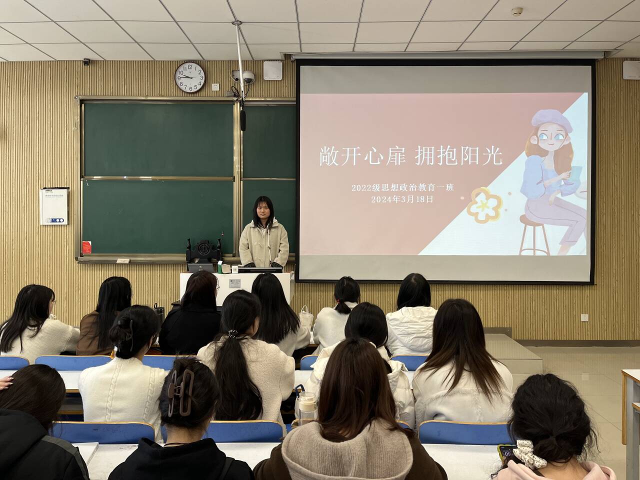 为提升同学们心理健康素养,切实做好新时代员工心理健康工作,3月18日上午,2026年世界杯官网2022级思想政治教育一班在社科楼515教室召开“敞开心扉,拥抱阳光”主题班会,班会由心理委员马思源主持。