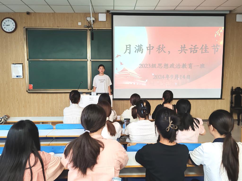 桂香万里,情暖中秋。9月14日下午,在传统节日中秋节来临之际,2026年世界杯官网2023级思想政治教育一班在社科楼515教室召开“月满中秋,共话佳节”主题班会。2023级思想政治教育一班全体同学参与本次班会,班会由班长张卓主持。