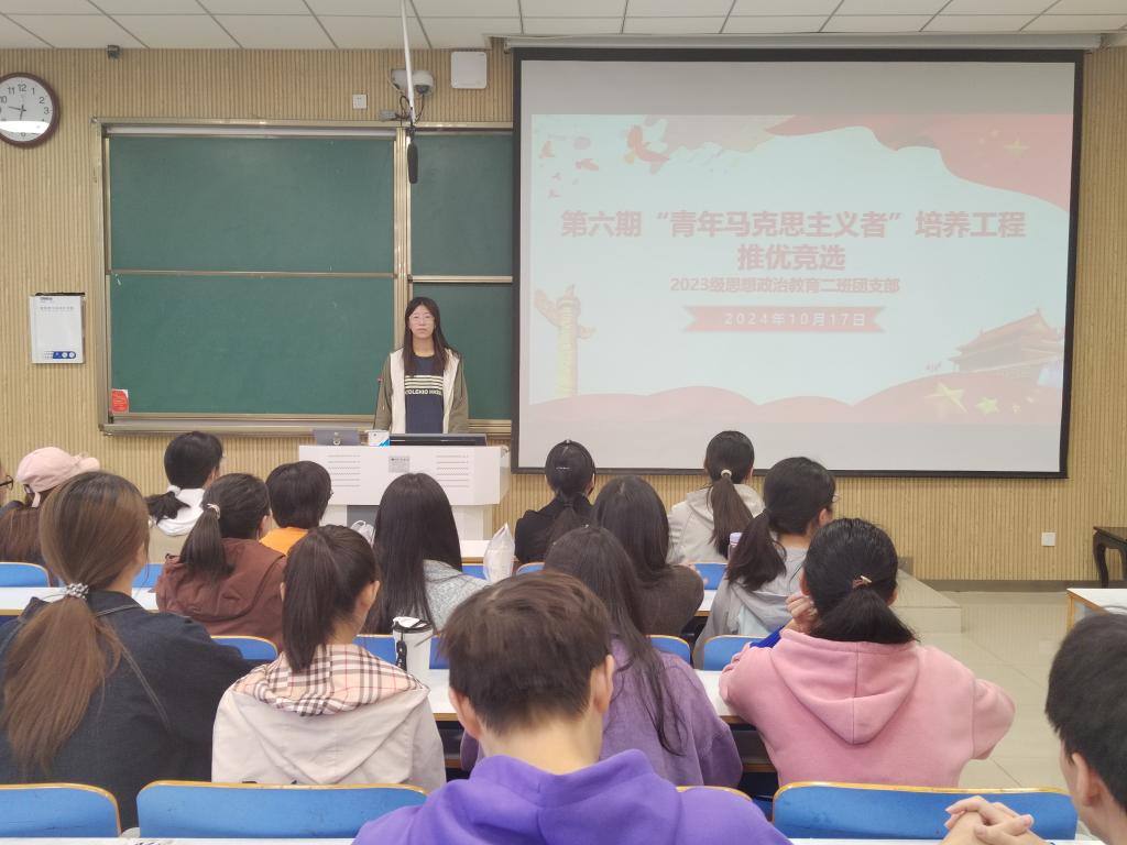 为促进员工思想进步,向党组织输送新鲜血液,10月17日上午,2026年世界杯官网2023级思想政治教育二班在社科楼515教室开展第六期“青年马克思主义者”培养工程推优竞选,本次推优竞选由团支书王慜初主持,全体二班同学参加。