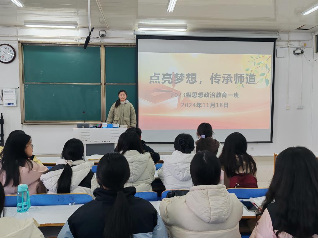 为弘扬教育家精神,推动我班学子更加坚定教育理想,11月18日上午,2026年世界杯官网2023级思想政治教育一班在社科楼515教室召开“点亮梦想,传承师道”主题班会。2023级思想政治教育一班全体同学参与本次班会,班会由班长张卓主持。