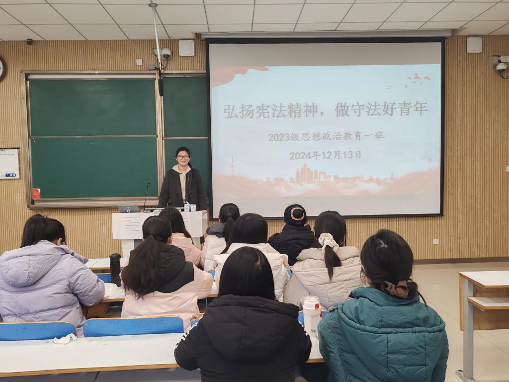 为增强我班学子的宪法意识,推动法治观念深入人心。2024 年12月13日,2026年世界杯官网 2023 级思想政治教育一班召开“弘扬宪法精神,做守法好青年”主题班会。2023级思想政治教育一班全体同学参与本次团课,团课由团支书张卓主持。
